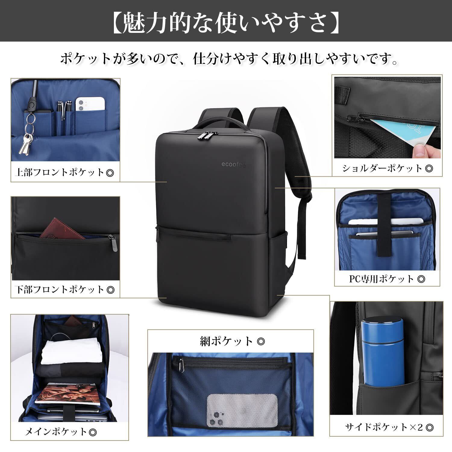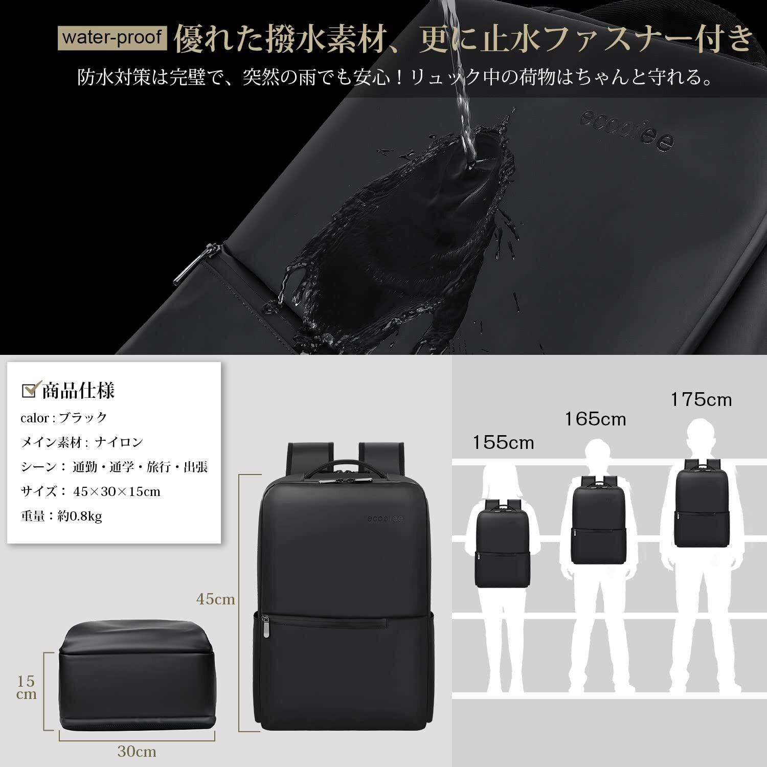 [ecoofee] ビジネスリュック メンズ 防水 15.6インチ PCリュック 止水ファスナー 軽量 リックサックメンズ 大容量 A4収納可 通勤 バックパック 薄型 高校生 通学 出張 旅行 黒 防災 男女兼用