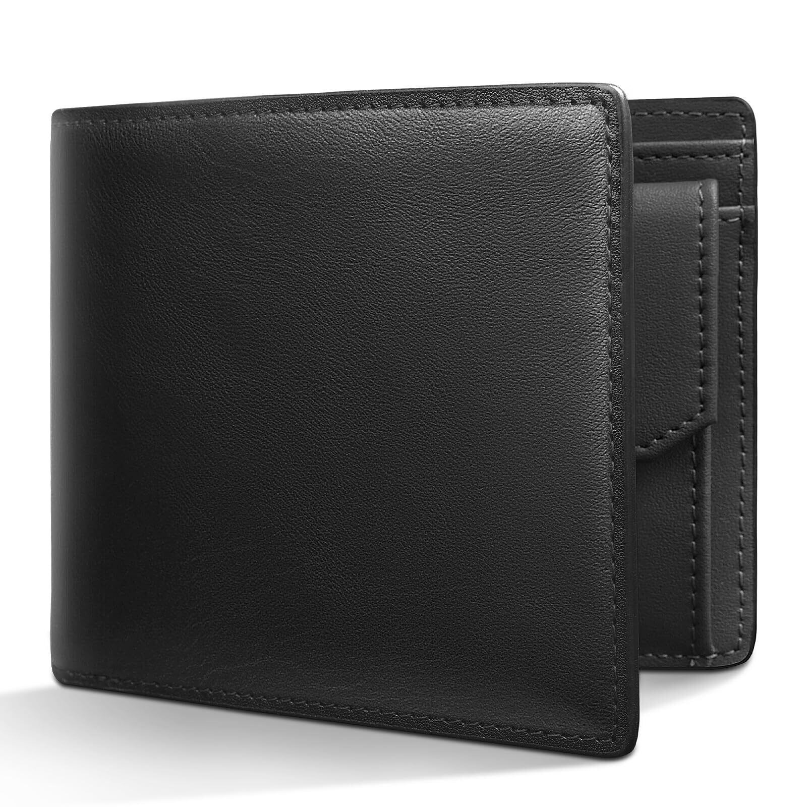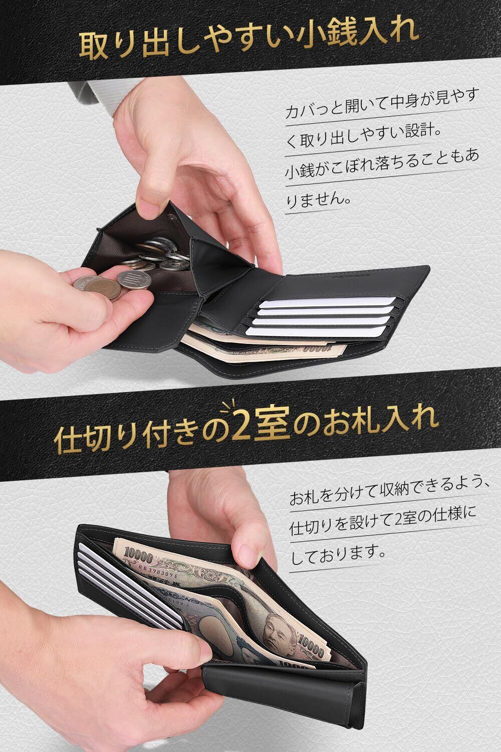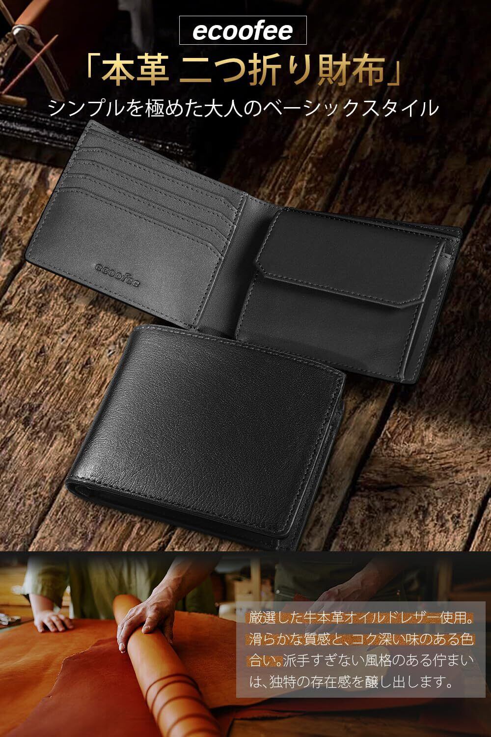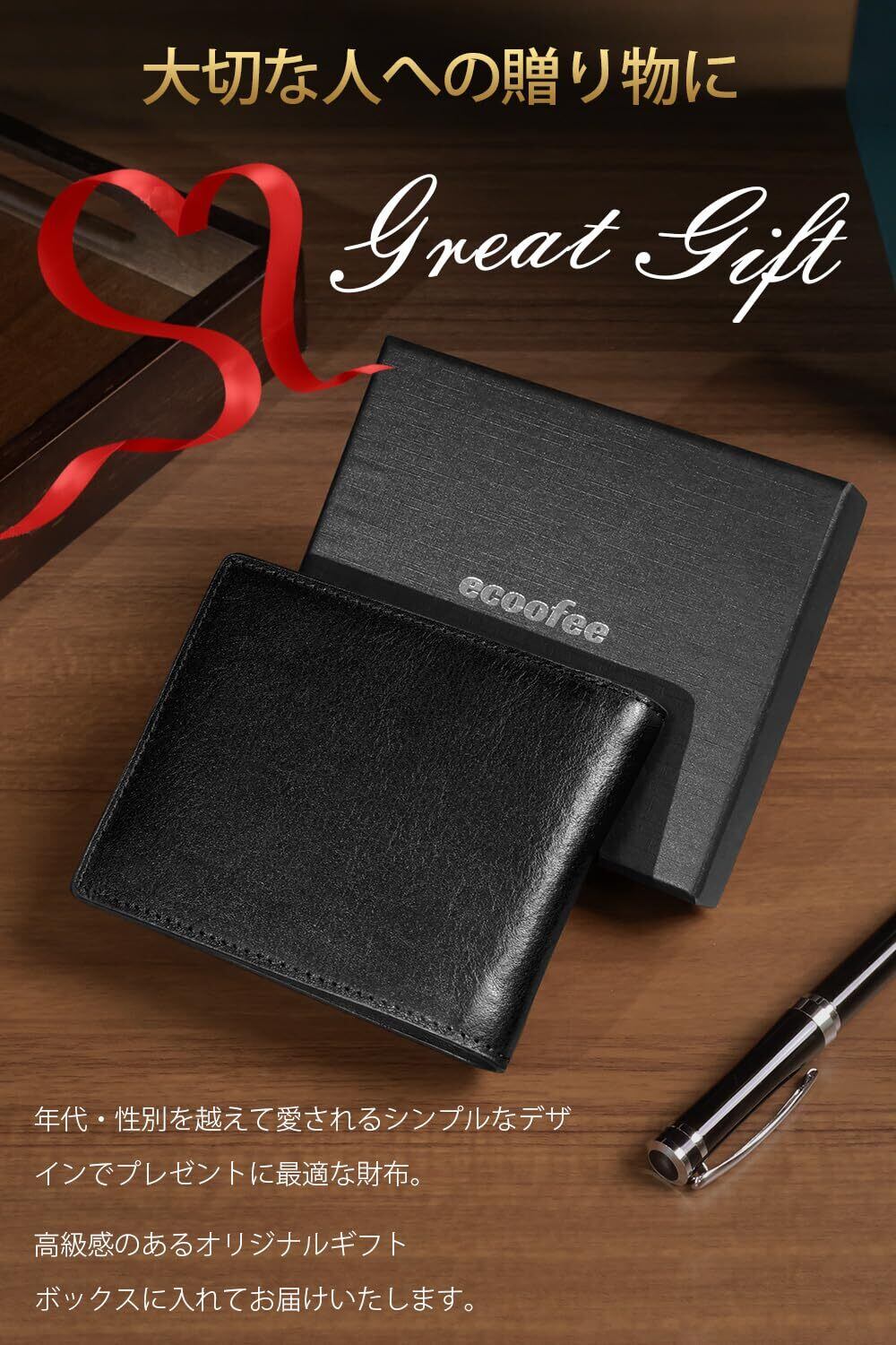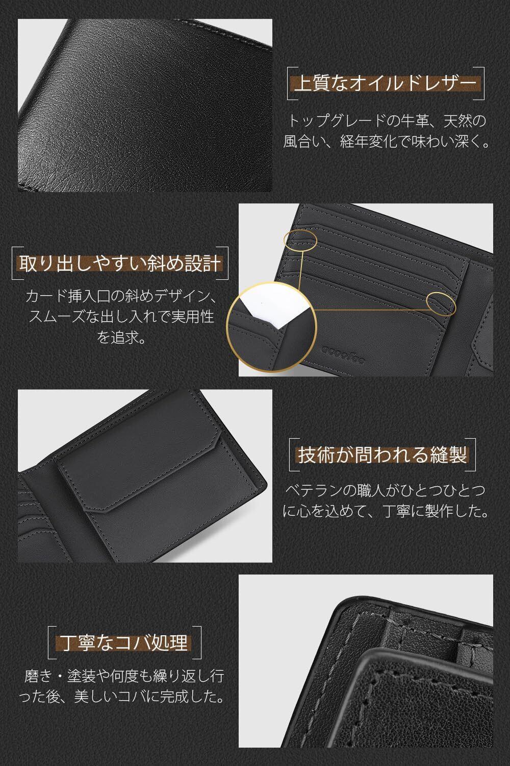 [ecoofee] 財布 メンズ 2つ折り オイルドレザー 本革 コンパクト 大容量 RFIDスキミング防止 使いやすい 二つ折り財布 薄い 一流の職人が作る メンズ財布 折りたたみさいふ 人気ブランド 男性 紳士用 ギフトBOX入り プレゼント 父の日(Black×Black)