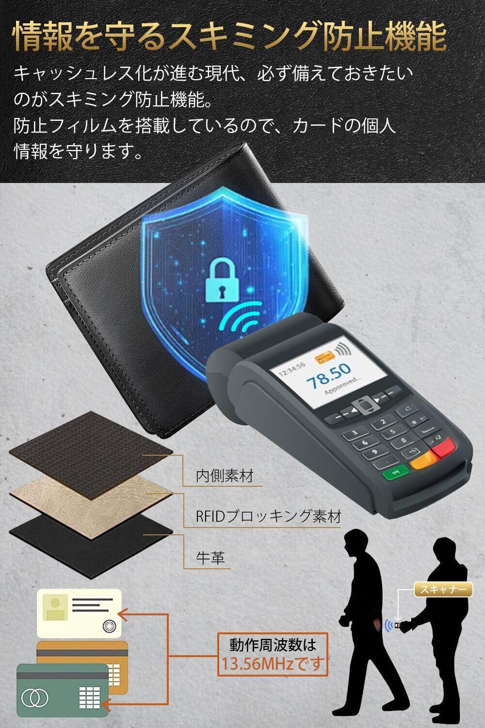 【最先端セキュリティで守る安心設計】二つ折り財布全面にRFIDブロック機能を採用したセキュリティ強化モデル。特殊電波遮断素材がICチップの不正読み取りを完全ブロックし、クレジットカードや電子マネーの情報漏洩を防ぎます。特に都心部での電車通勤時や人混みでの利用時に効果を発揮する安心設計。内側に使用した高密度マイクロファイバーは静電気防止加工を施し、カードの傷付きを最小限に抑えます。「安全」と「快適」を両立させた次世代型財布として、現代人のライフスタイルに合わせた進化を遂げました。