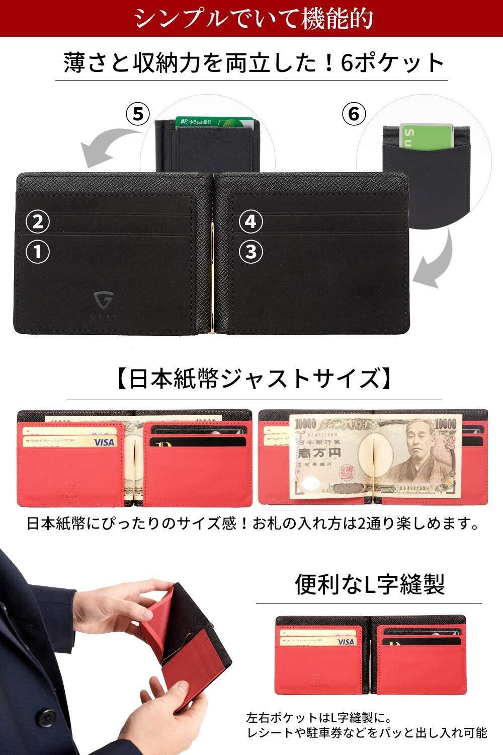【 サイズ×素材 】サイズ:縦88mm、横115mm、厚さ17mm 日本紙幣ジャストサイズ!海外製品には日本紙幣に対応していない規格もありますのでお気をつけ下さい。 素材:高品質PUレザー カードポケット部分はimitation microfiberを採用!カードの出し入れのしやすさを改善いたしました。 仕様:内側 カード入れ×4、外側 ICカード入れ×1、隠しポケット×1 BOX型小銭入れ付き 素材と色のコントラストが高級感をさらにUP! ワンランク上の存在感を醸し出す マネークリップとなっております。