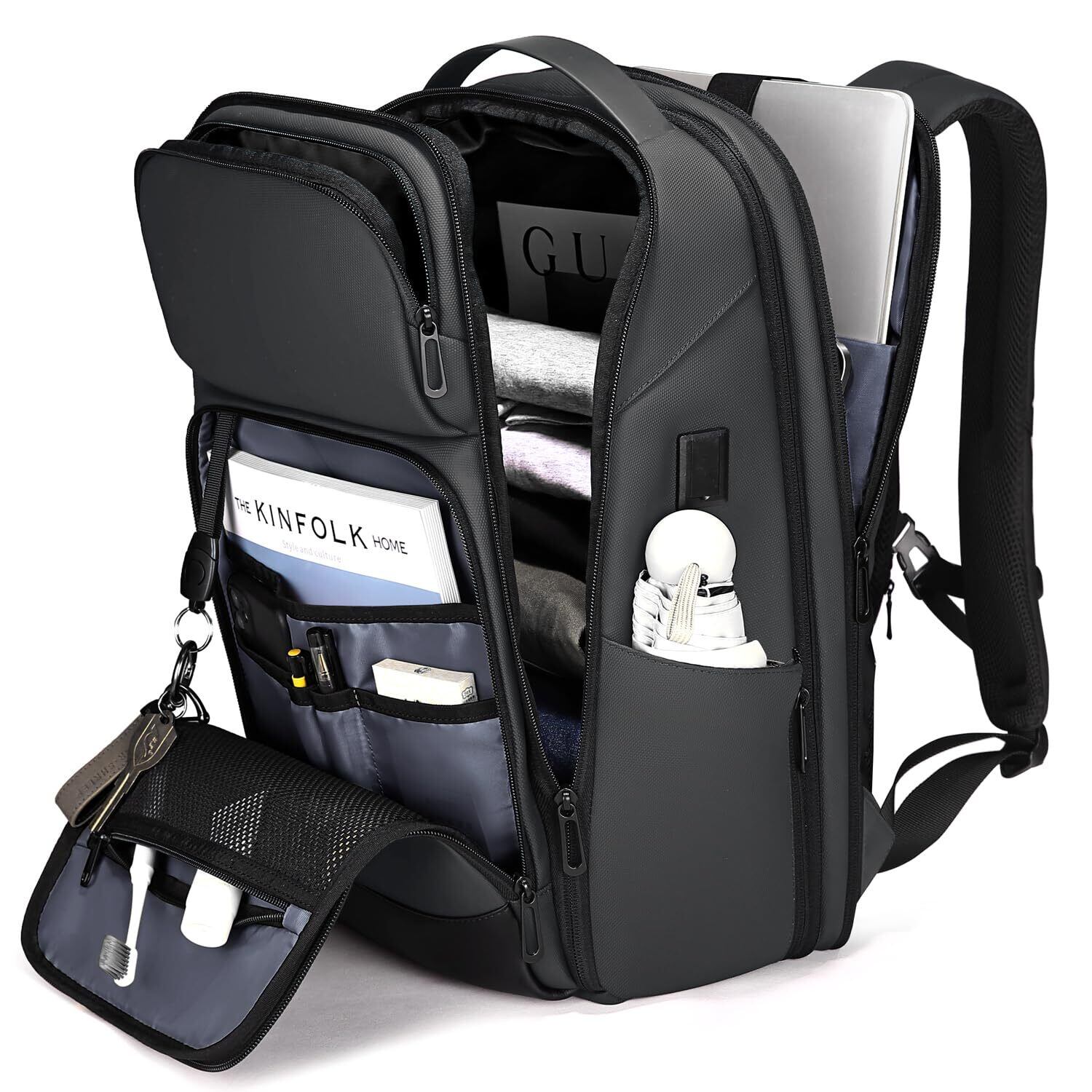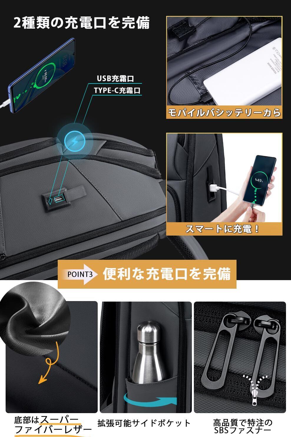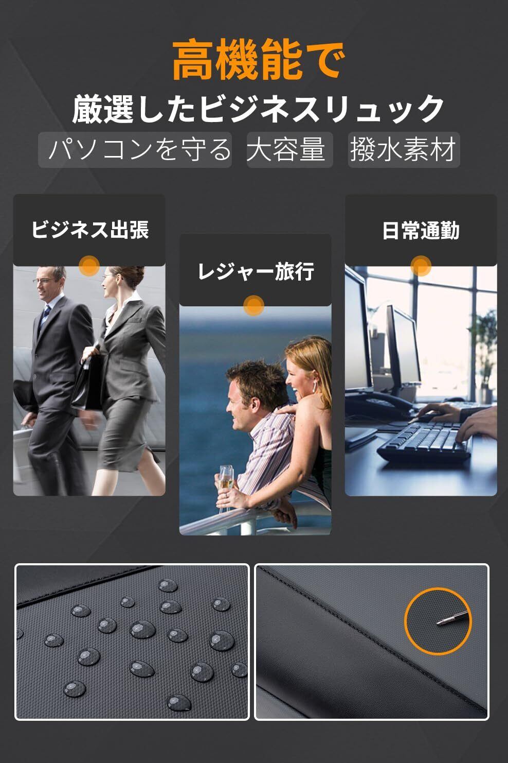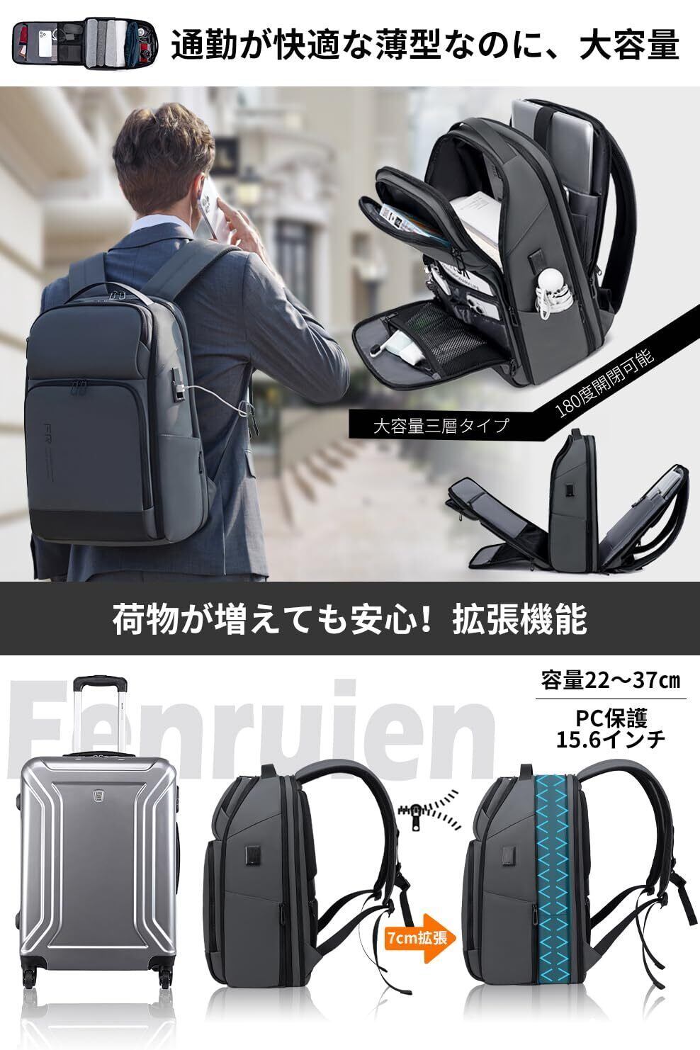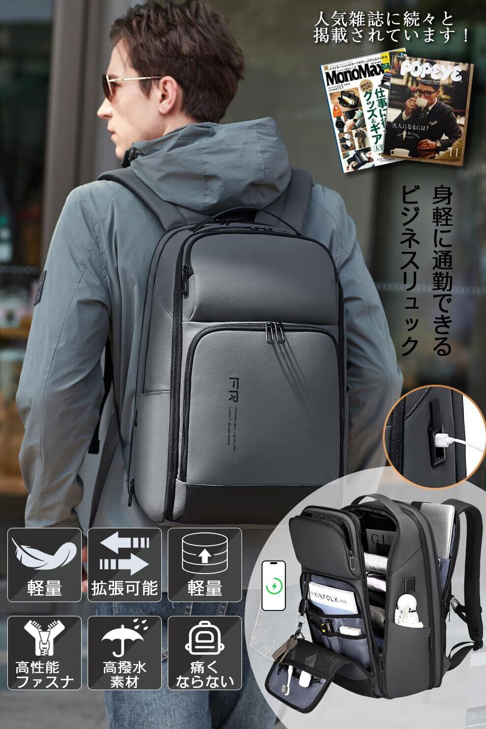 【USB充電ポート搭載・拡張可能・180°開閉】USBケーブルをリュック側の端子に接続するだけで、背負ったまま充電が可能です。耐久性のある生地を使用し、ビジネスシーンにも対応。金属製のダブルスライダーは滑りやすく、丈夫で長持ちします。リュックには7cmの拡張機能があり、専用のPCコンパートメントも完備。厚手の抗衝撃生地で17インチまでのノートパソコンをしっかり保護します。大容量で傘やA4書類、3〜5日分の着替えも収納可能。出張や日常使いに便利な設計です