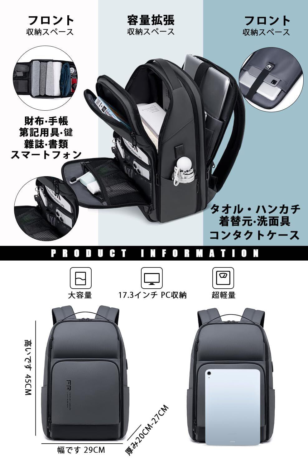 [FENRUIEN] リュック メンズ ビジネスリュック リュックサック 大容量 PCラップトップバック 防水 17インチ ビジネスバッグ マチ拡張 USB充電ポート 黒 型崩れ防止 通学 通勤 出張