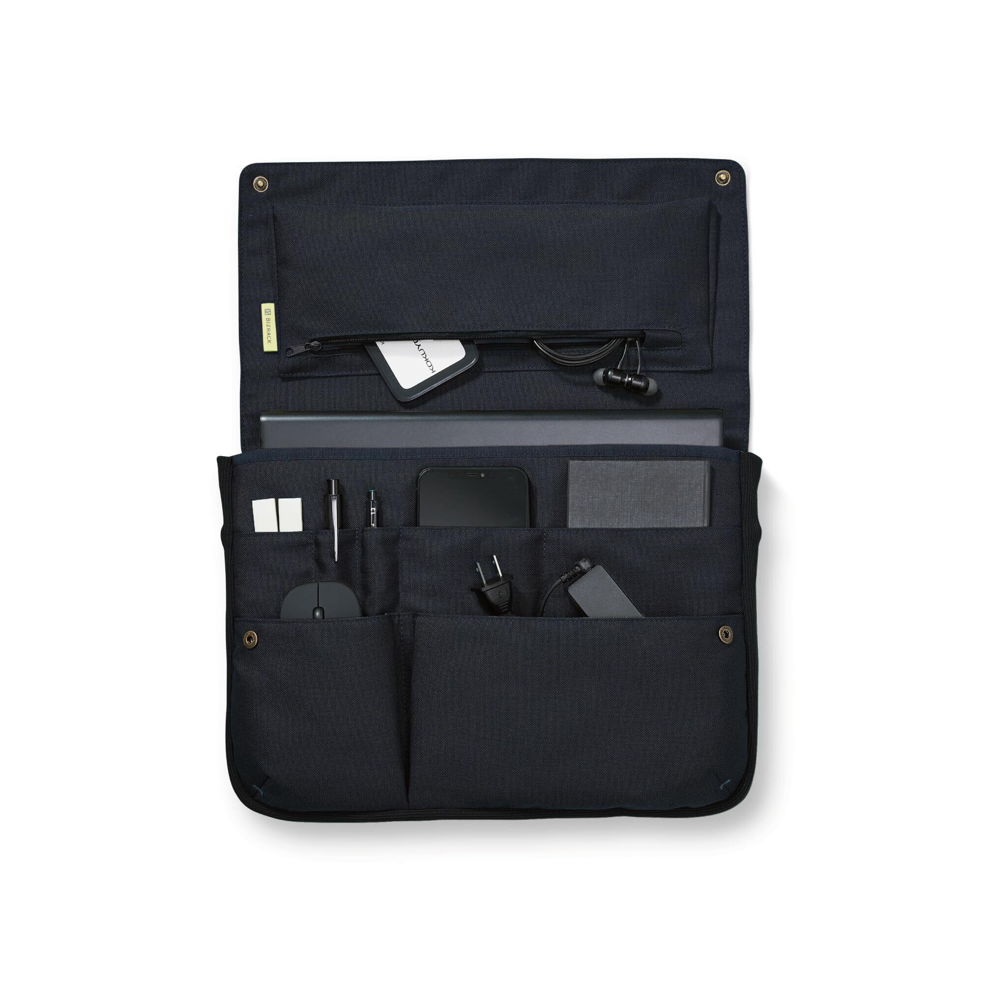 文房具からPC周辺のツールまで一式を収容することができる機能的なポケット。マウスやACアダプタの専用ポケットを設けることで、PCを傷つけにくく収容効率が高まる設計。またファスナー付きポケットにはIDカードや名刺などの大切な物を収容するのに便利。