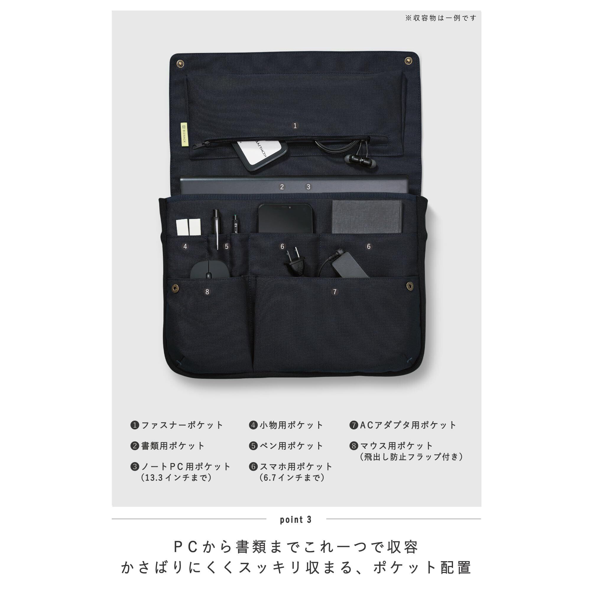 POINT3:PCから書類までこれ一つで収容。かさばりにくくスッキリ収まる、ポケット配置。