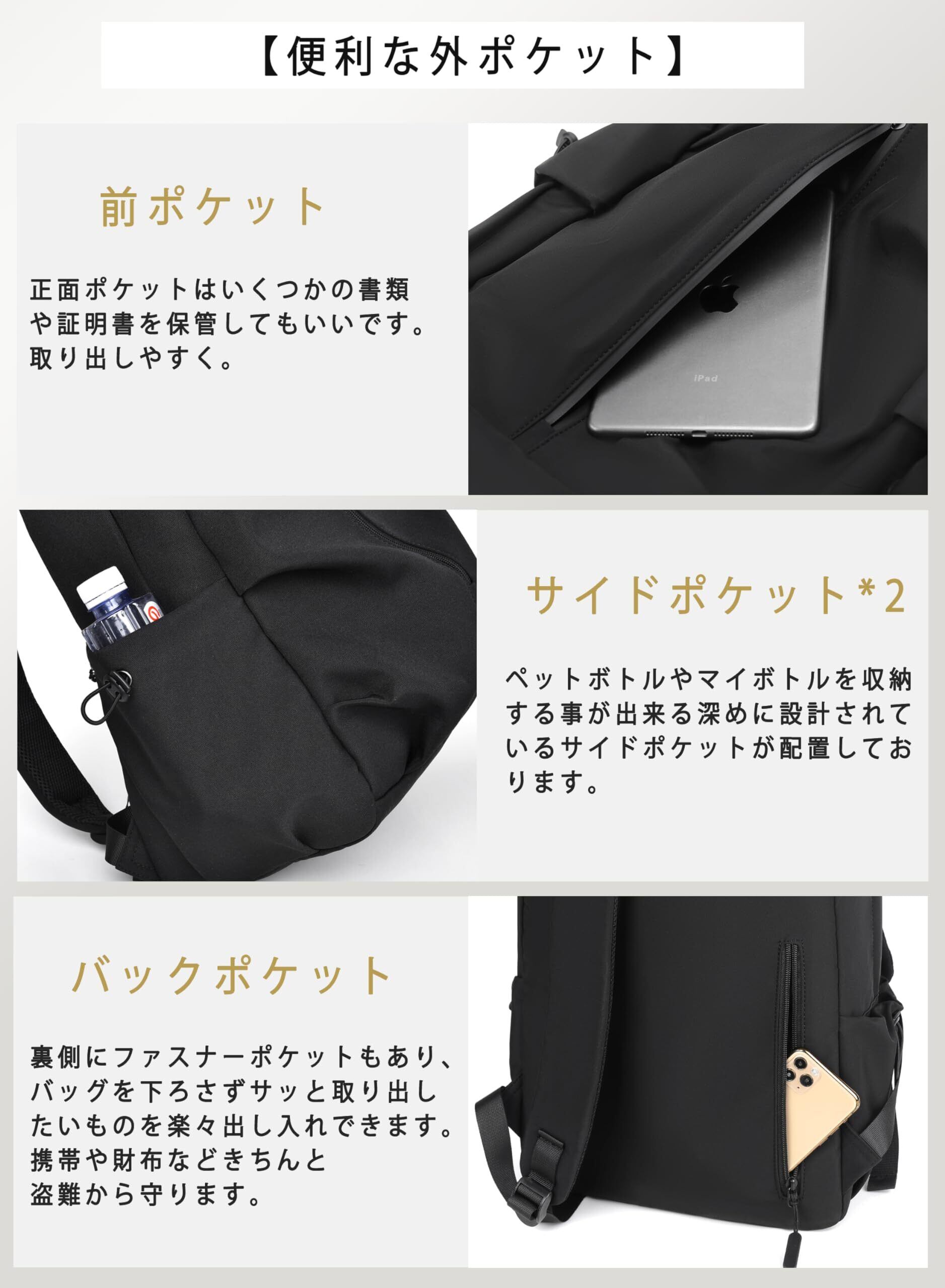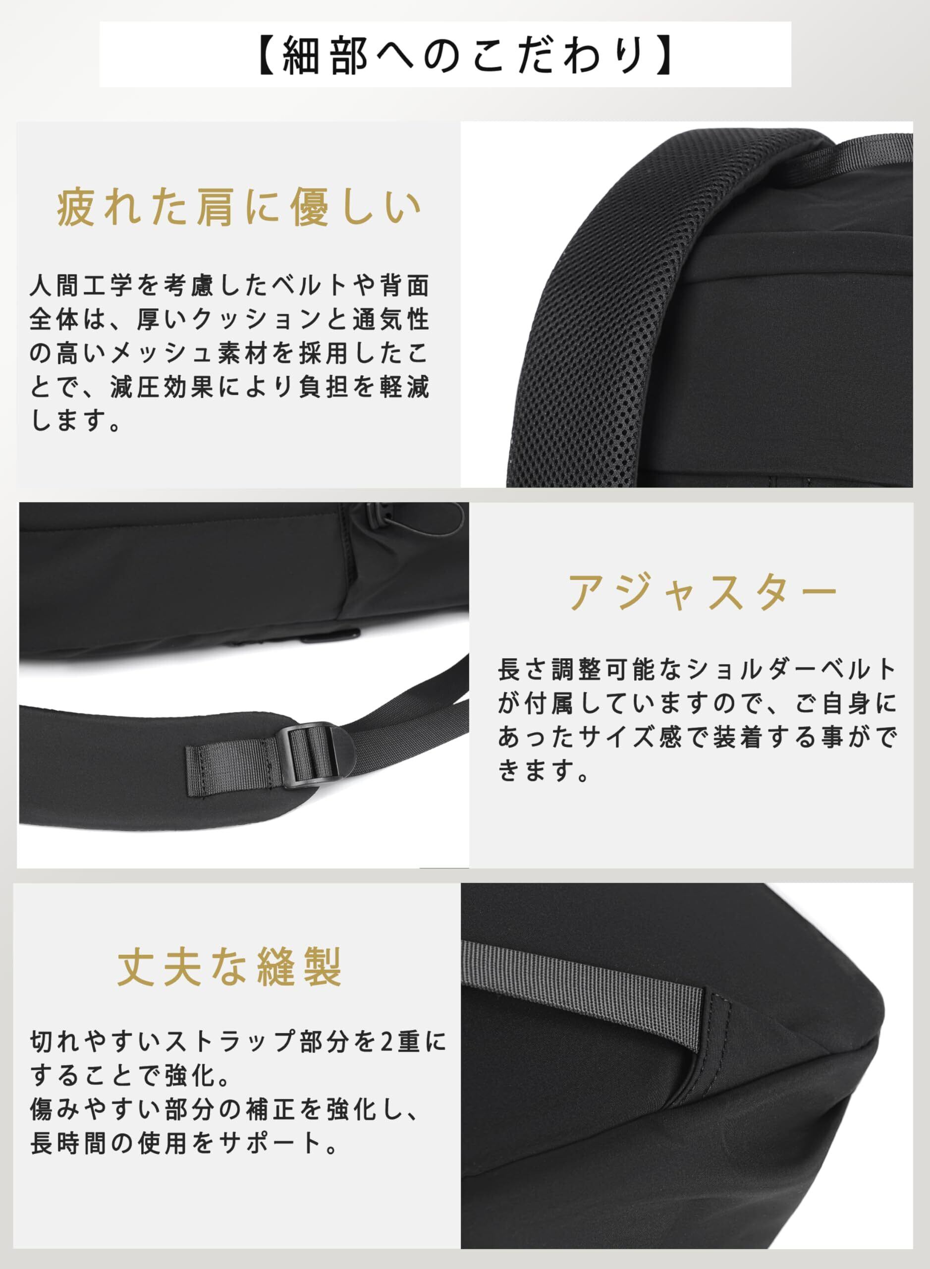【高品質素材】高品質のポリエステルオックスフォード生地を採用し、優れた撥水性を持ち、急な雨や汚れからバッグの中身を守ります。耐摩耗性が高く、引き裂きに強く長持ちできます。背面には厚みのあるクッション材を内蔵し、長時間に背負っても楽々です。
