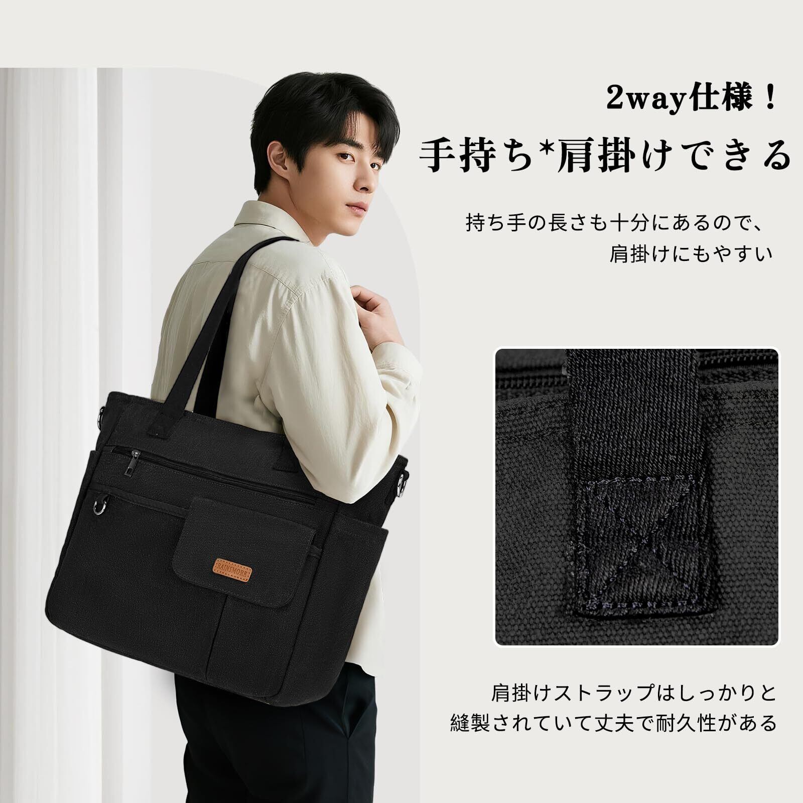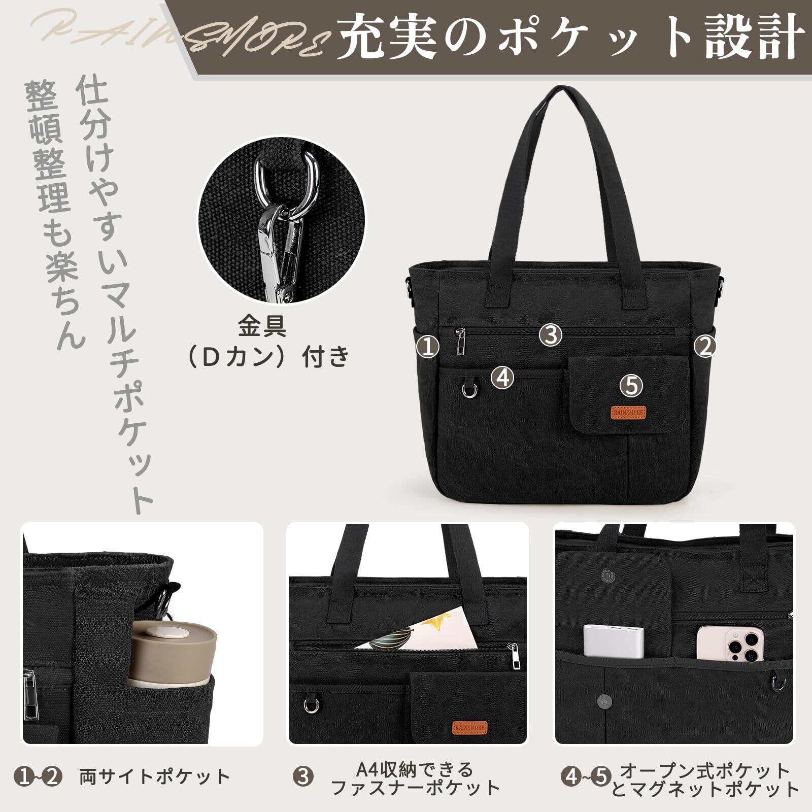 [RAINSMORE] トートバッグ メンズ 大容量 手提げバッグ 撥水加工 A4 キャンバス ショルダーバッグ レディース ファスナー付き 軽量 男女兼用 通勤 通学