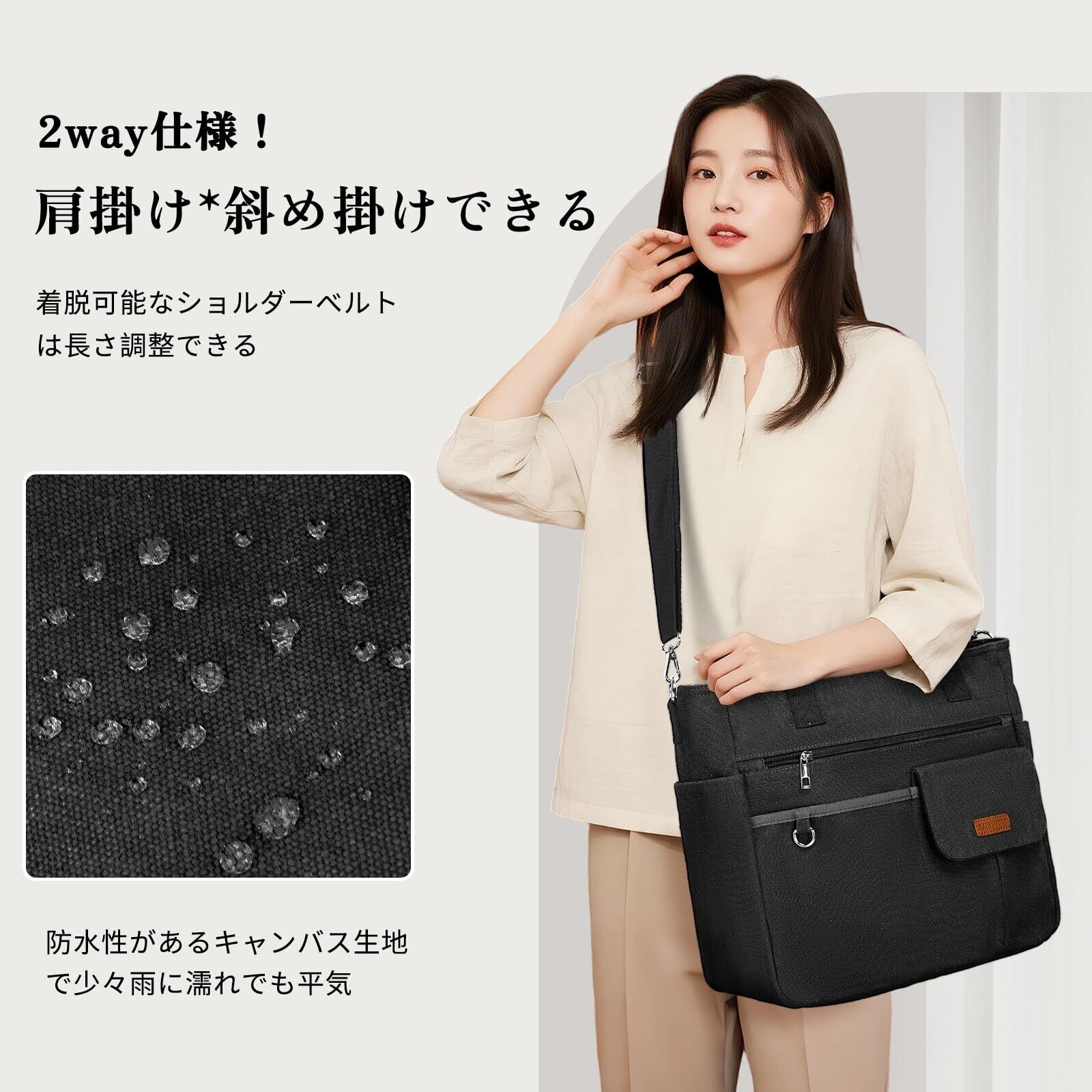 撥水加工のキャンバス素材:本商品で使用しているキャンバス生地は、耐久性、優れた頑丈さと撥水加工の特徴が持ています。肌触りが柔らかくて、雨の日にお出かけでもバッグの中身に濡れることは心配する必要がありません