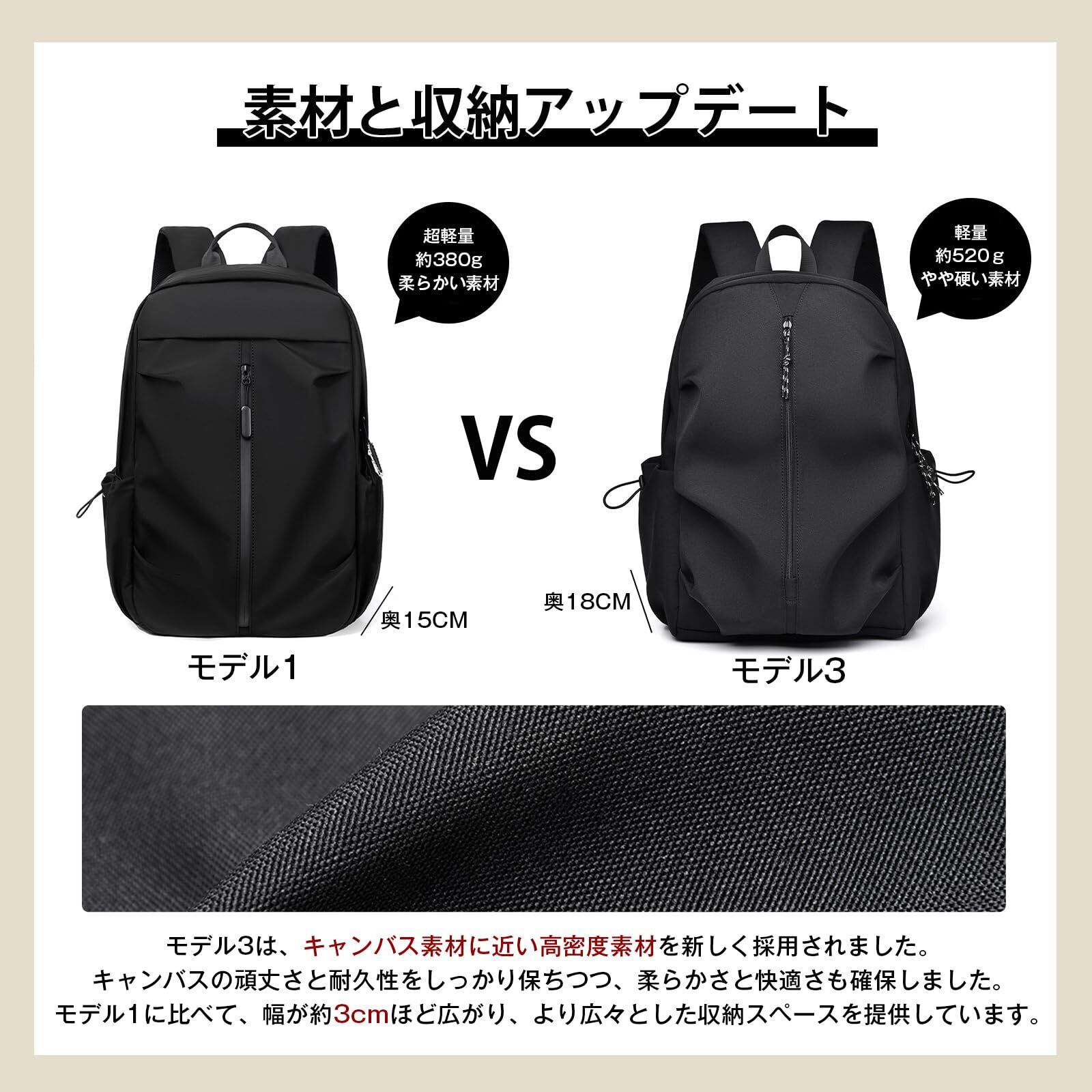 「モデル3 vs モデル1 素材と収納アップデート 」モデル3は、キャンバス素材に近い高密度素材を新しく採用されました。キャンバスの頑丈さと耐久性をしっかり保ちつつ、柔らかさと快適さも確保しました。モデル1に比べて、幅が約3cmほど広がり、より広々とした収納スペースを提供しています。