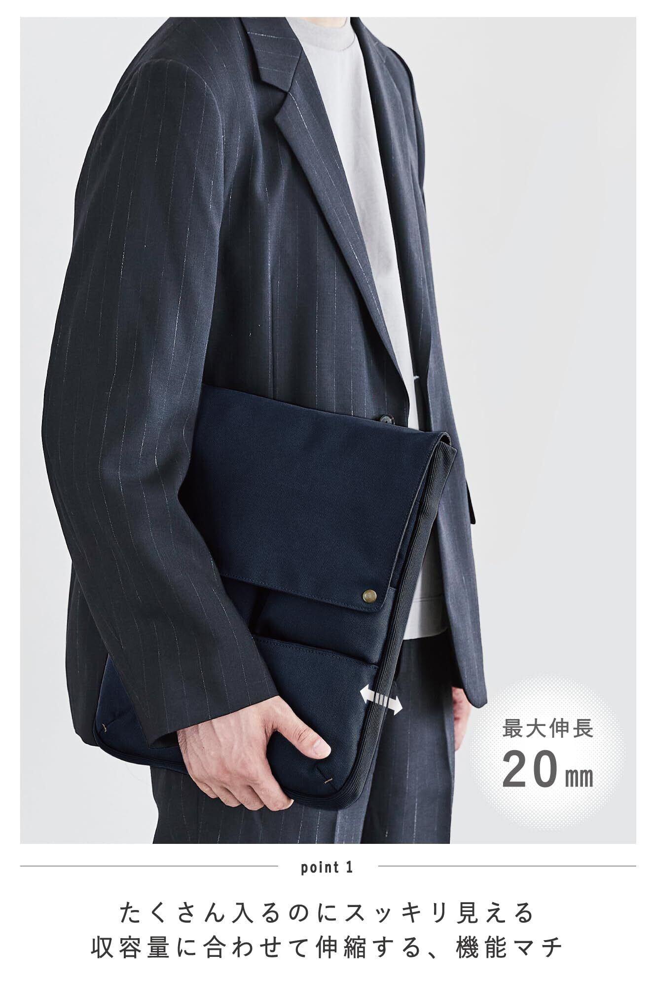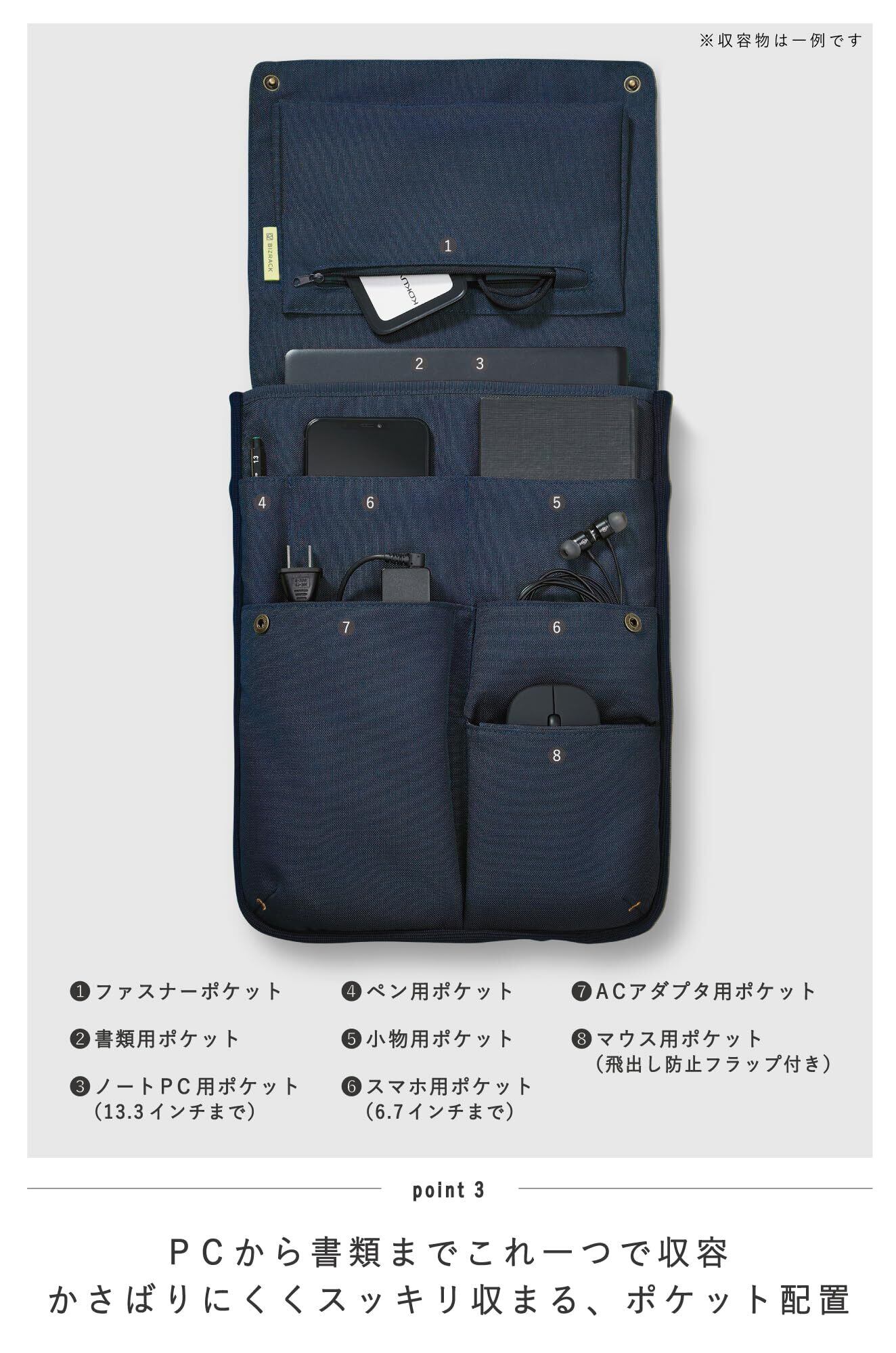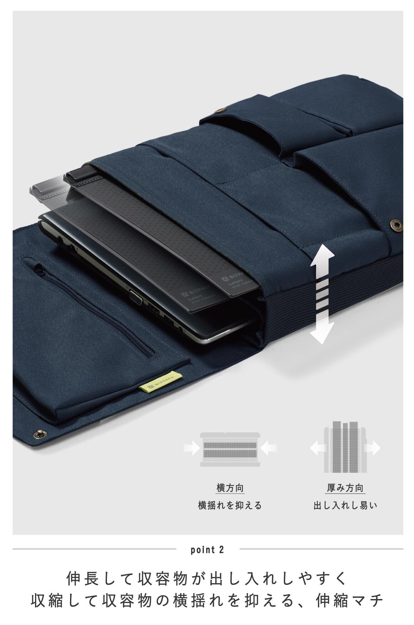 ■■たくさん入るのにスッキリとみえるバッグインバッグ BIZRACK■■・収容量に合わせて伸縮するマチ生地・開口部が大きく開いて書類を出し入れしやすい・かさばりにくいレイアウトのポケット・閉めたときにフラットにみえるポケットとフタの設計・フタを折り返してバッグに入れると収容物にアクセスしやすい商品仕様・寸法/W260×D45×H345mm(13.3インチノートPC対応)・質量/270g・材質/表材・内装:ポリエステル、芯材:PE