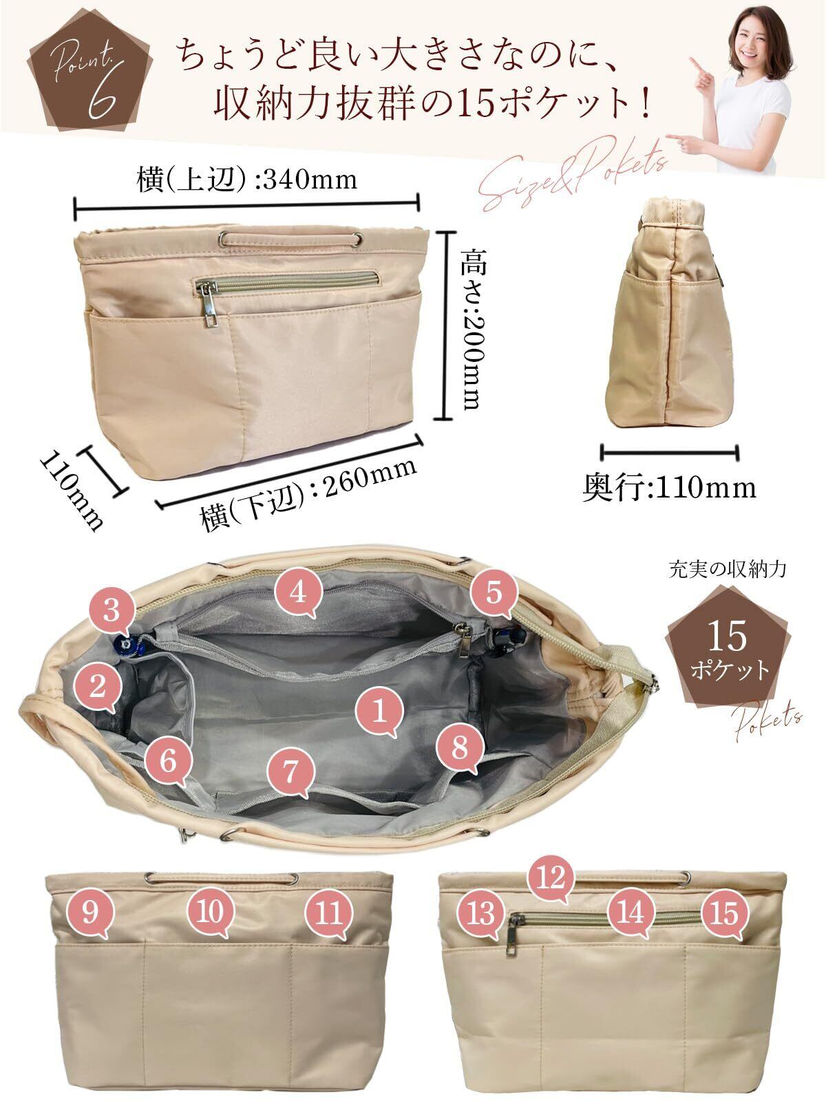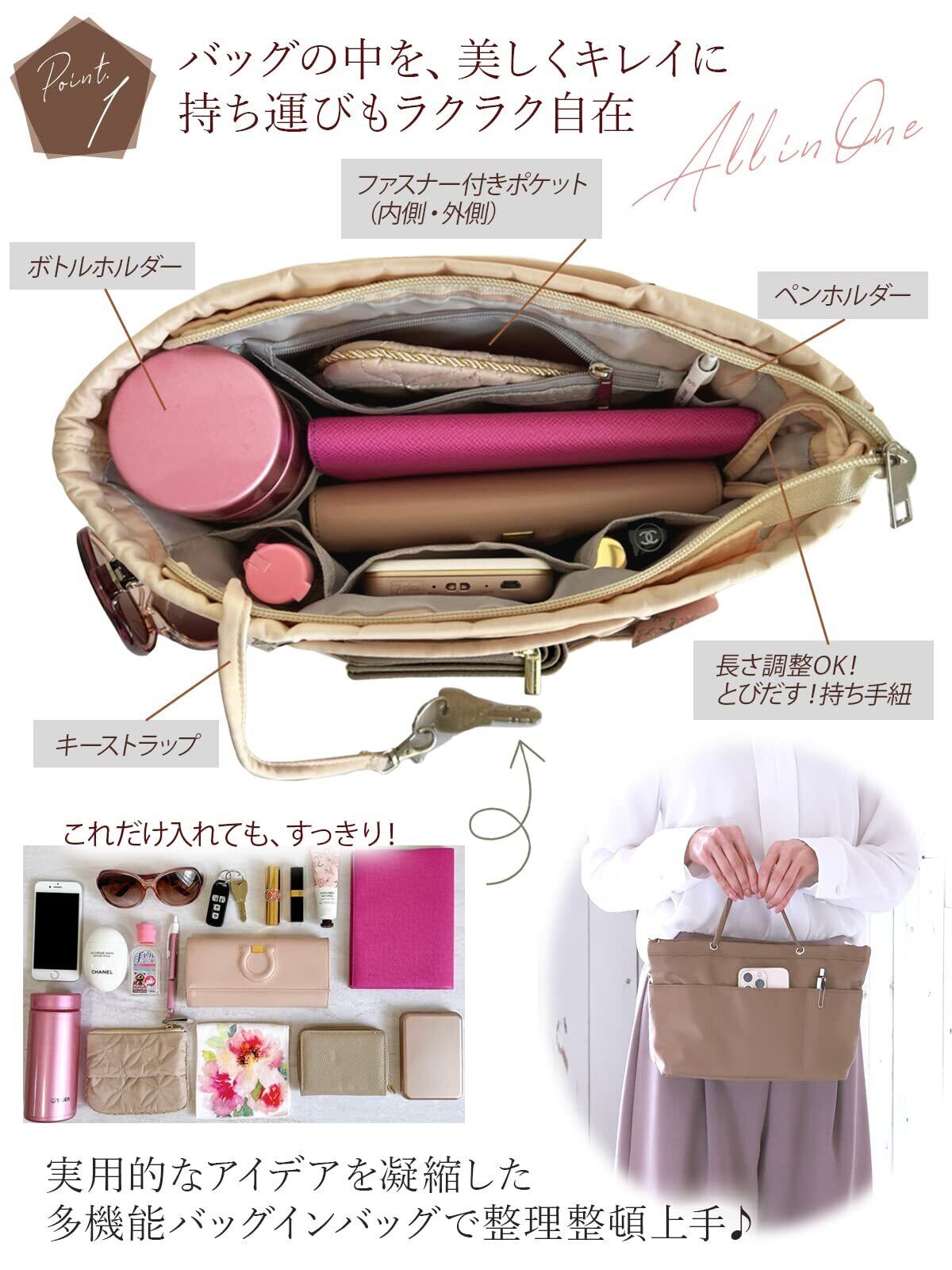 【バッグの中をスッキリ整理】 トートバッグなどで散らかりがちな小物類をスッキリ収納。内外に多数のポケットを備え、整頓しやすい構造になっています。【サイズ】上部幅34cm、下部幅26cm、高さ20cm、マチ幅11cm、底板200×100mm、重さ約220g