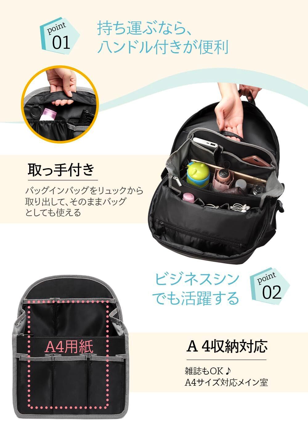 バッグインバッグ リュック[A4 形崩れない] 改良15ポケット b5 収納整理 大容量 軽量 ナイロン インナーバッグ インナーポケット 収納力 仕分け デイパック・ザックに便利 メンズ レディース バッグインリュック