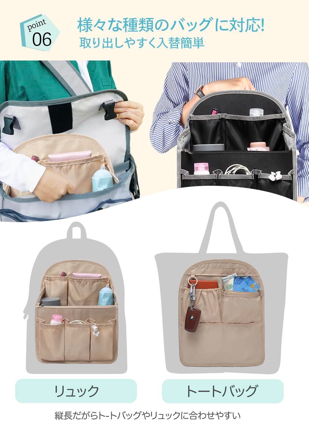 【様々な場所に大活躍】 作りがしっかりして多機能なので通勤の時だけでなく、買い物、ちょっとした旅行する時に収納バッグとしても大活躍です。携帯、手帳や化粧品など、すべての小物がきちんと直立して固定され、スムーズに取り出せます。