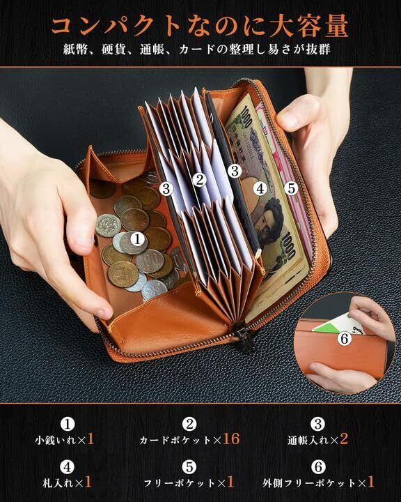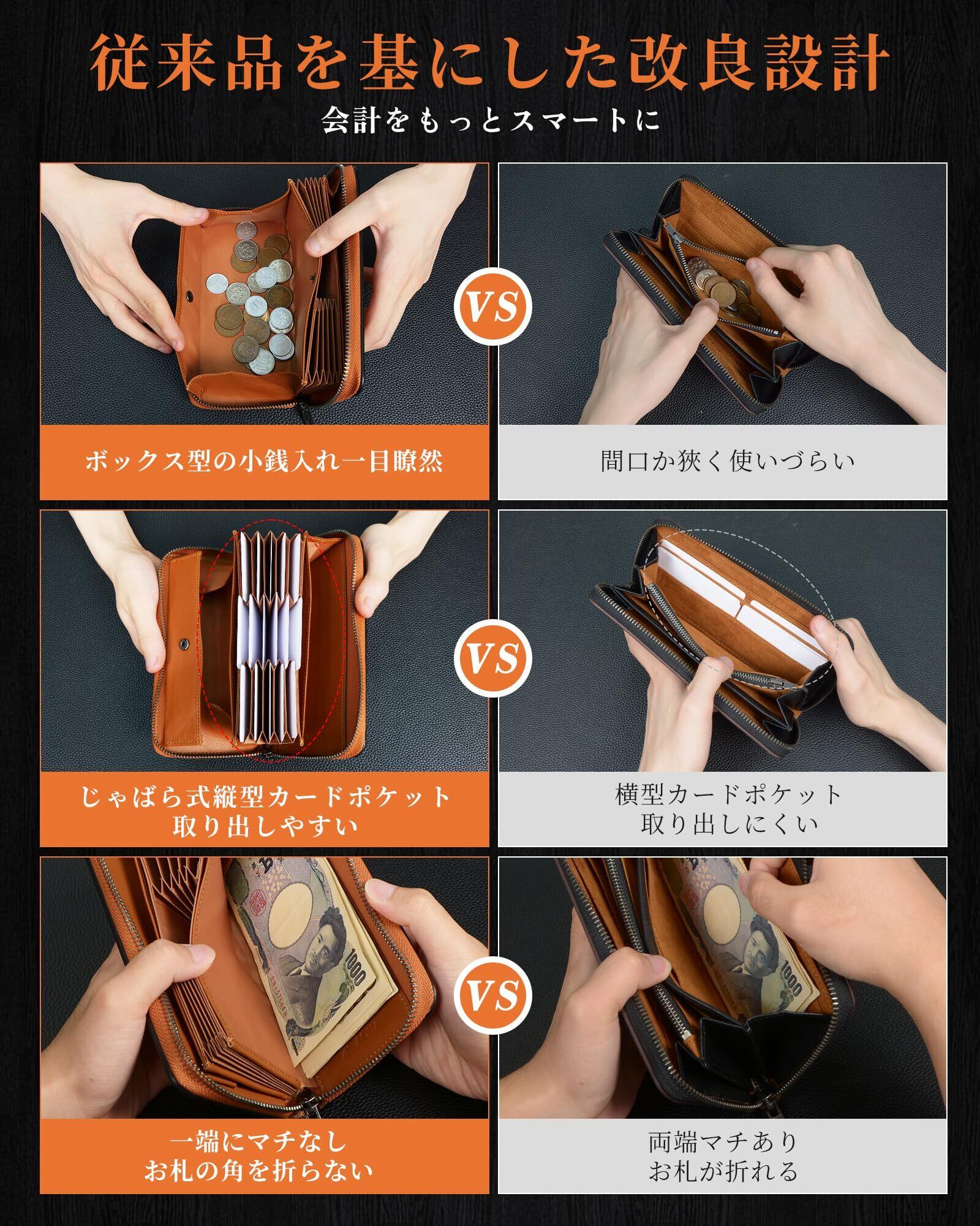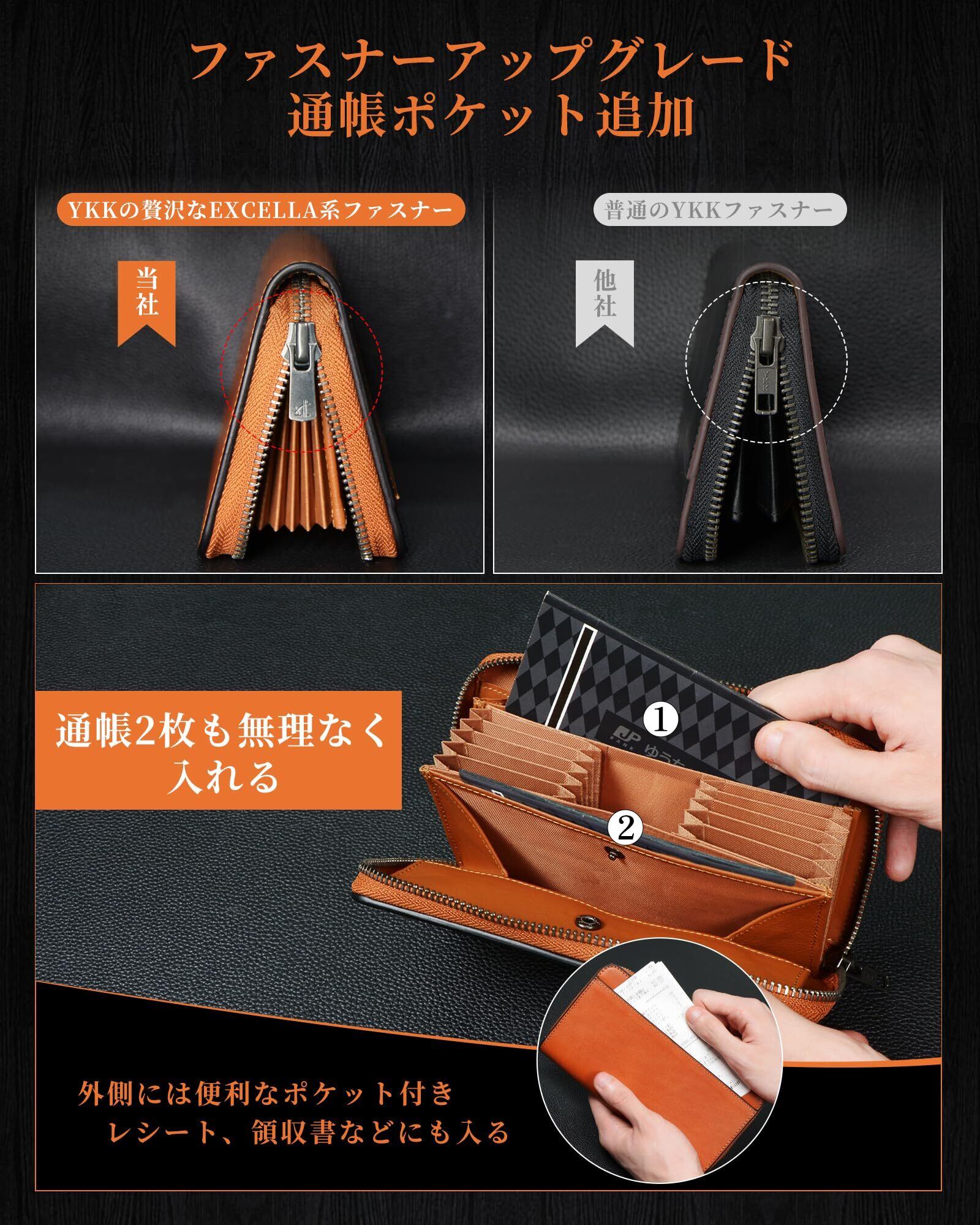 【使いやすいコンパクトサイズ】本革財布を開けると、カードがそれぞれ独立して立ち並ぶので見やすく出し入れしやすい。キャッシュレス時代に最適でカード決済に抜群の実力を発揮する、時短長財布です。「お支払いの動線」を意識し、従来のメンズ長財布を基づいて、「通帳ポケット」を追加し、おろしたお金をしまいつつ、通帳も一緒に持ち運びが出来て便利です。小銭だけではなく、鍵・領収書などの収納にも最適です。外側ポケットにカード入れがあるので、頻繁に使いそうなものをしまっておくことができます。