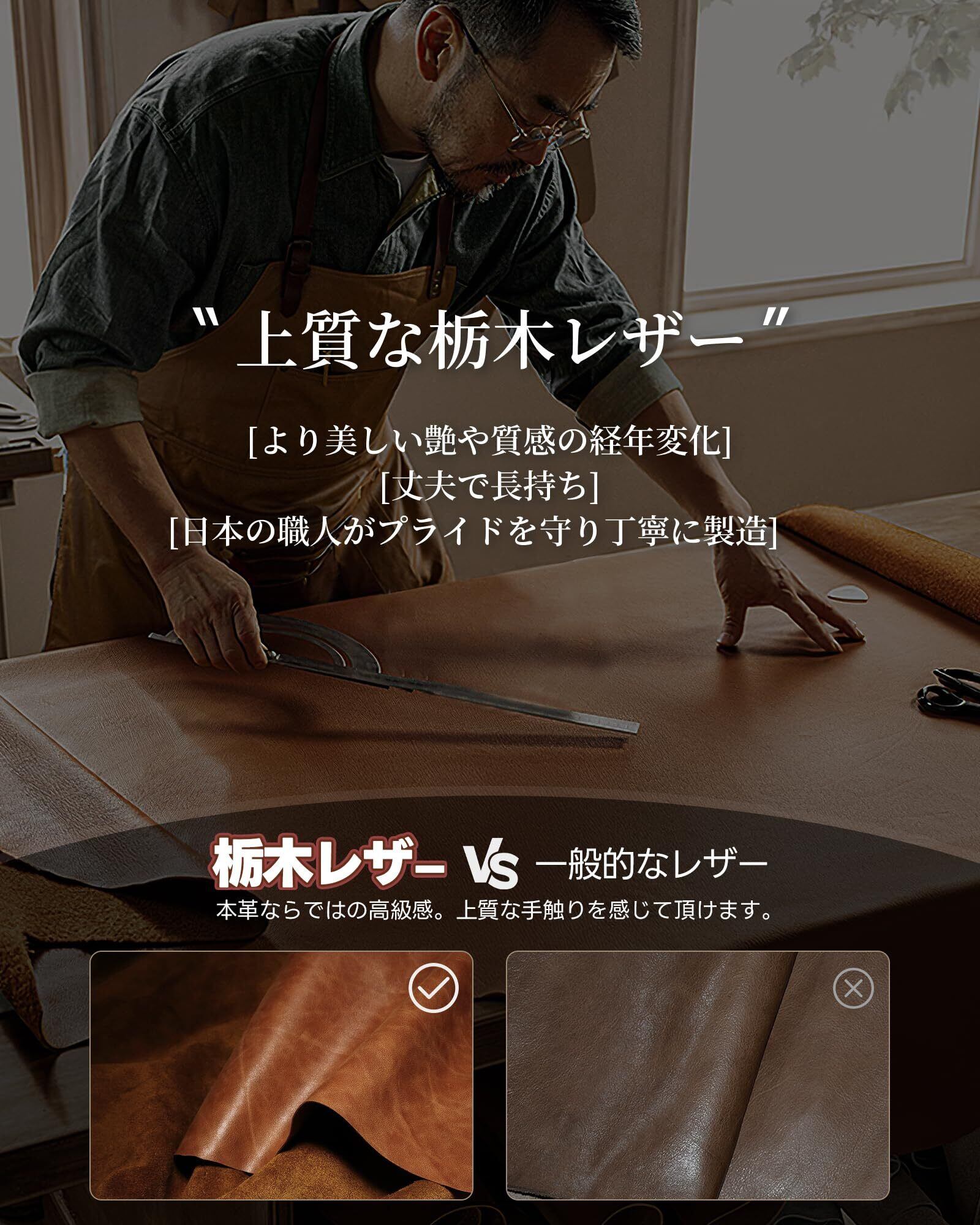 【日本最高の栃木レザーとYKKファスナー使用】国内屈指の技術を誇るタンナー"栃木レザー"のフルベジタブルタンニングレザーを使用した長財布、独自のなめし方法を使用しており、柔軟性と光沢がありながらも頑丈さを保っています。長財布は表地と内地は栃木牛革を採用して、裏地にはナイロン素材となります。安心と耐久性抜群のYKKファフナーとこだわりの縫製も欠かせないで、長財布の故障要因として最も多いのがファスナー不良を効果的に対処します。