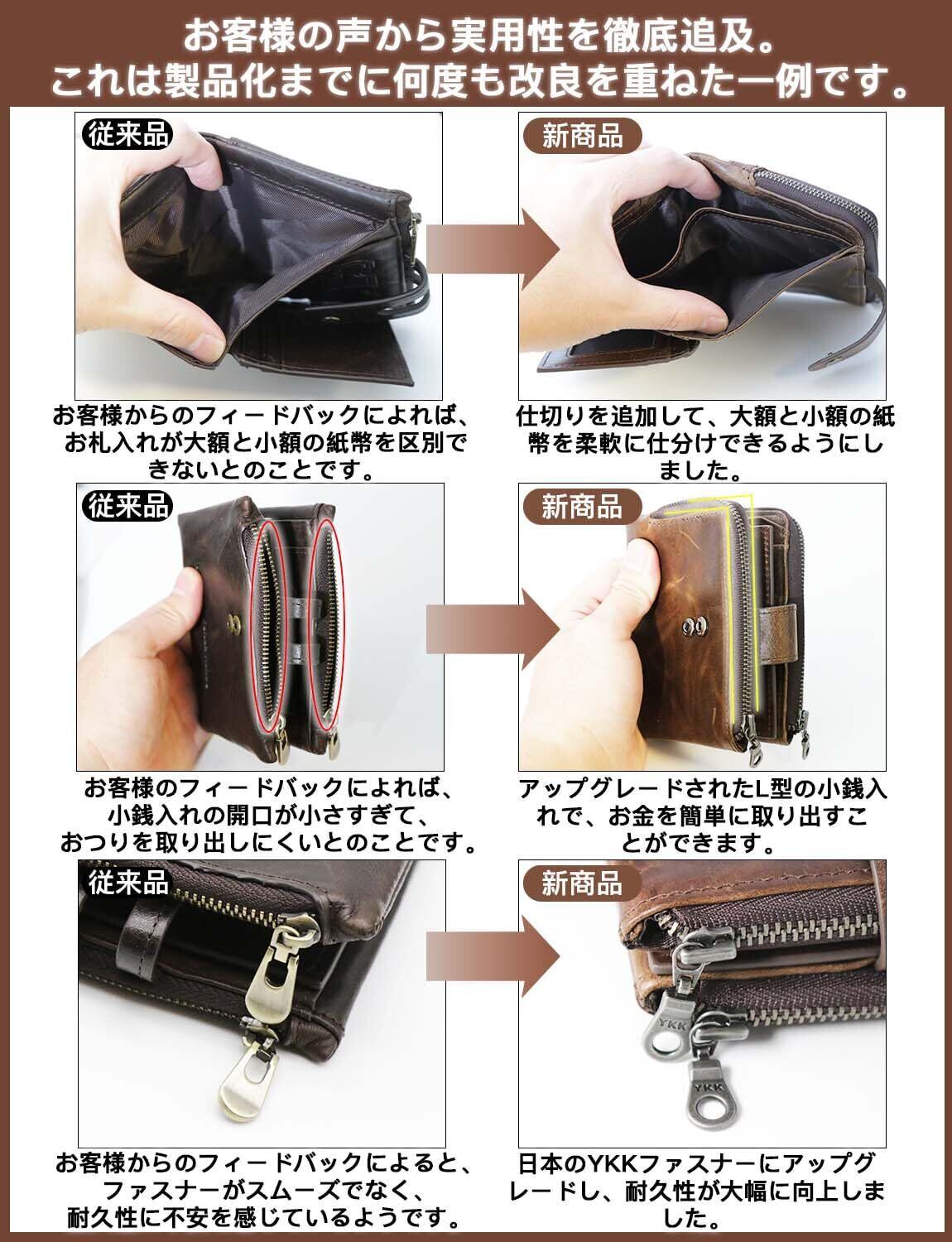 【高級ファスナー&YKK社製】お客様からのご意見をもとに、革職人と協力して大容量タイプを維持しつつ、二つ折り財布の小銭入れファスナーをYKKファスナーにアップグレードし、使いやすさにこだわった財布にリニューアルしました。高品質なファスナーを採用し、スムーズな開閉が可能です。また、小銭の種類を見分けやすいように、2つのポケットの小銭入れに変更しました。YKK製のファスナーをはじめ、膨らみにくく取り出しやすい小銭入れ、出し入れしやすいカードポケットなど、素材に加えて使い勝手も抜群です。メンズの2つ折り財布として、高い品質をお求めの方におすすめです