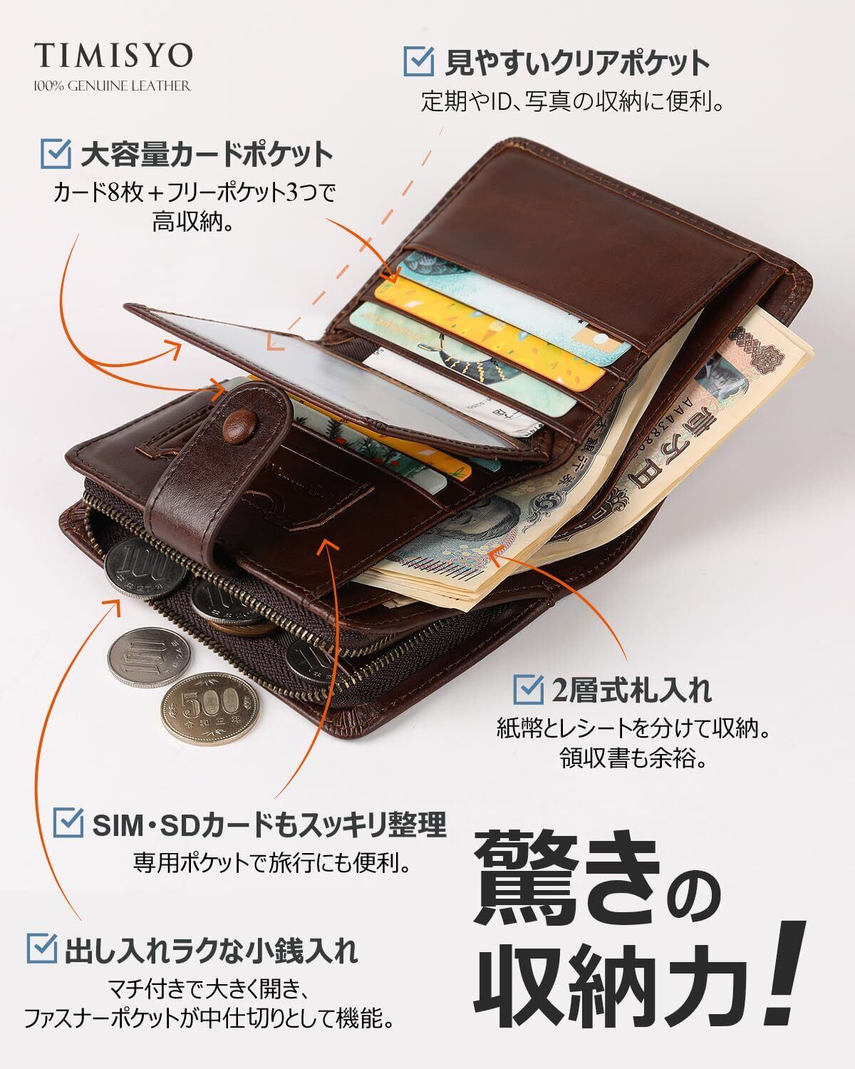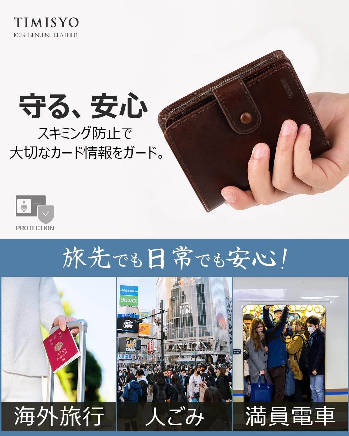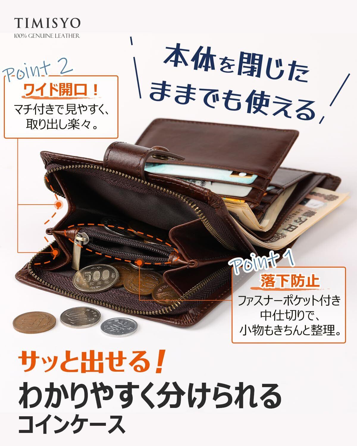 [TIMISYO] 二つ折り財布 メンズ 財布 本革 大容量 小銭入れ・多枚数カード入れ・札入れ・免許証入れ付き スキシング防止 ブラウン (TM-BW71)