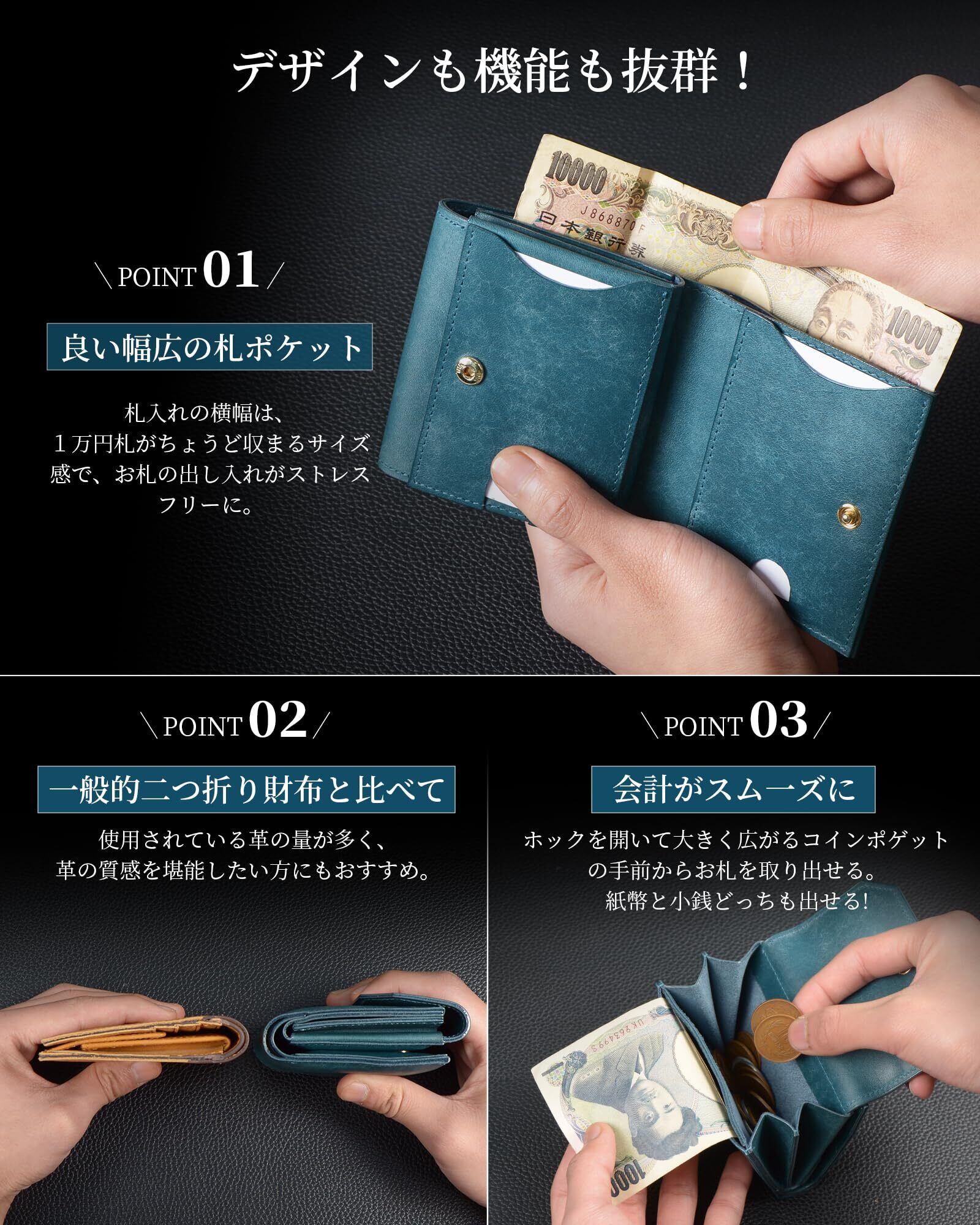 【紙幣マジック】 札ポケットの中央には仕切りがあり、コインポケット側と繋がっています。これにより、コインポケットの手前からもお札を取り出すことができ、財布を開かずに、コインとお札を同時に取り出して、スムーズに会計ができます。非常に便利本革 2つ折り財布です。