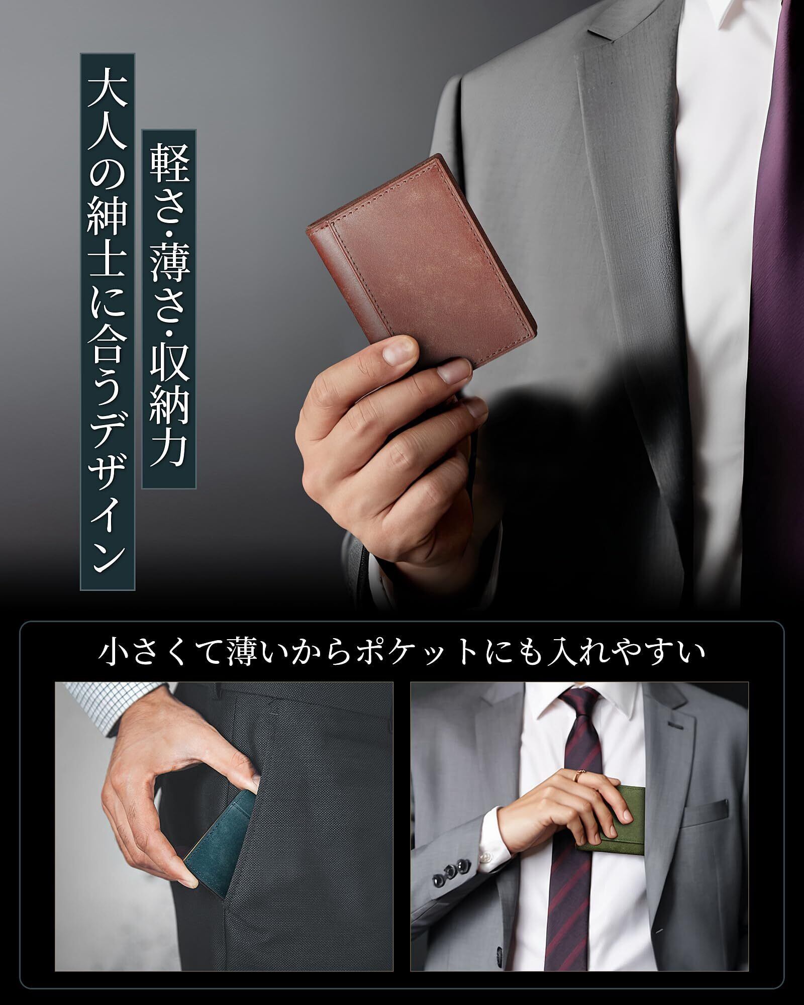 【薄くて、コンパクト】手のひらサイズ 小銭入れ メンズ 。約9.5cm×7cm×1.5cm。薄くて小さいからスーツの内ポケットやパンツのポケットに入れてもシルエットが崩れません。ミニマリストの男性にぴったりのアイテムです。
