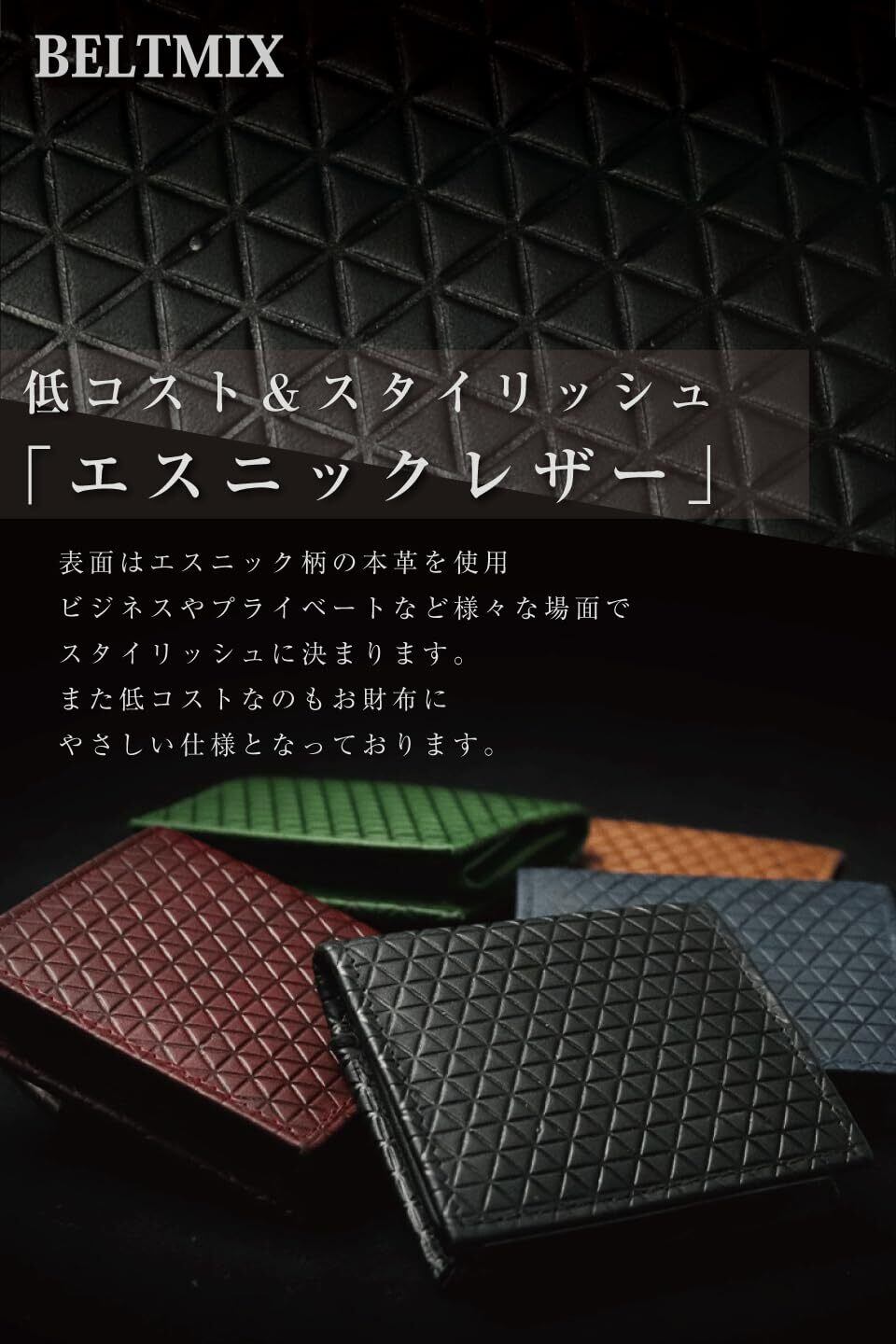 【低コスト&スタイリッシュ・エスニックレザー】表面にはエスニック柄の本革を使用。ビジネスやプライベートなど様々な場面でスタイリッシュに決まります。また低コストなのもお財布にやさしい仕様となっております。