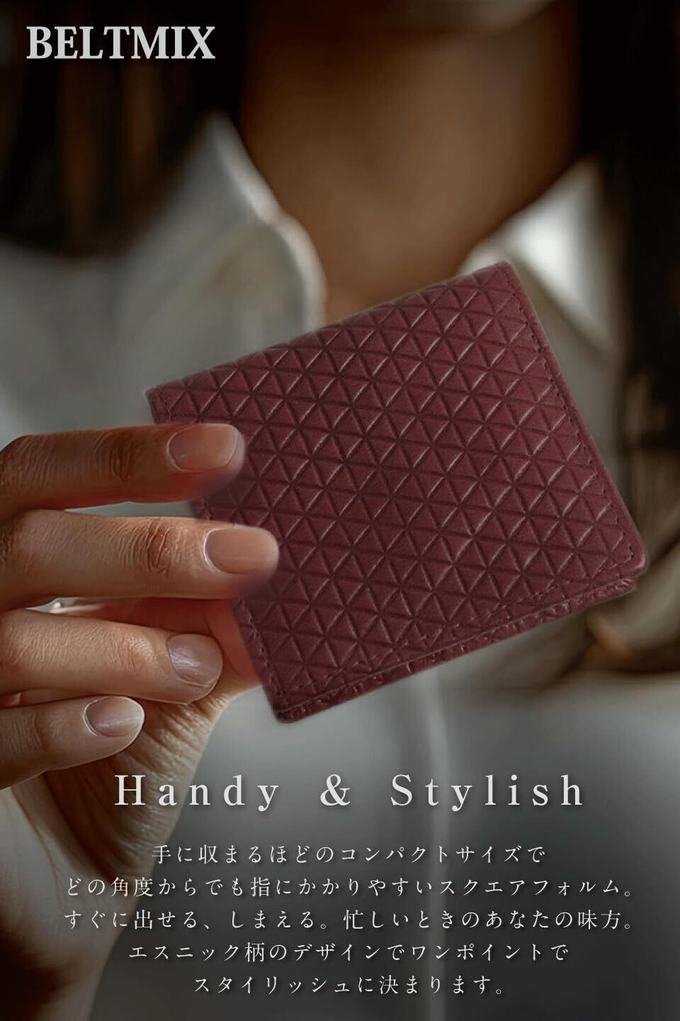 【Handy&Stylish】手に収まるほどのコンパクトサイズで、どの角度からでも指にかかりやすいスクエアフォルム。すぐに出せる。しまえる、忙しいときのあなたの味方。エスニック柄の生地のデザインでワンポイントでスタイリッシュに決まります。