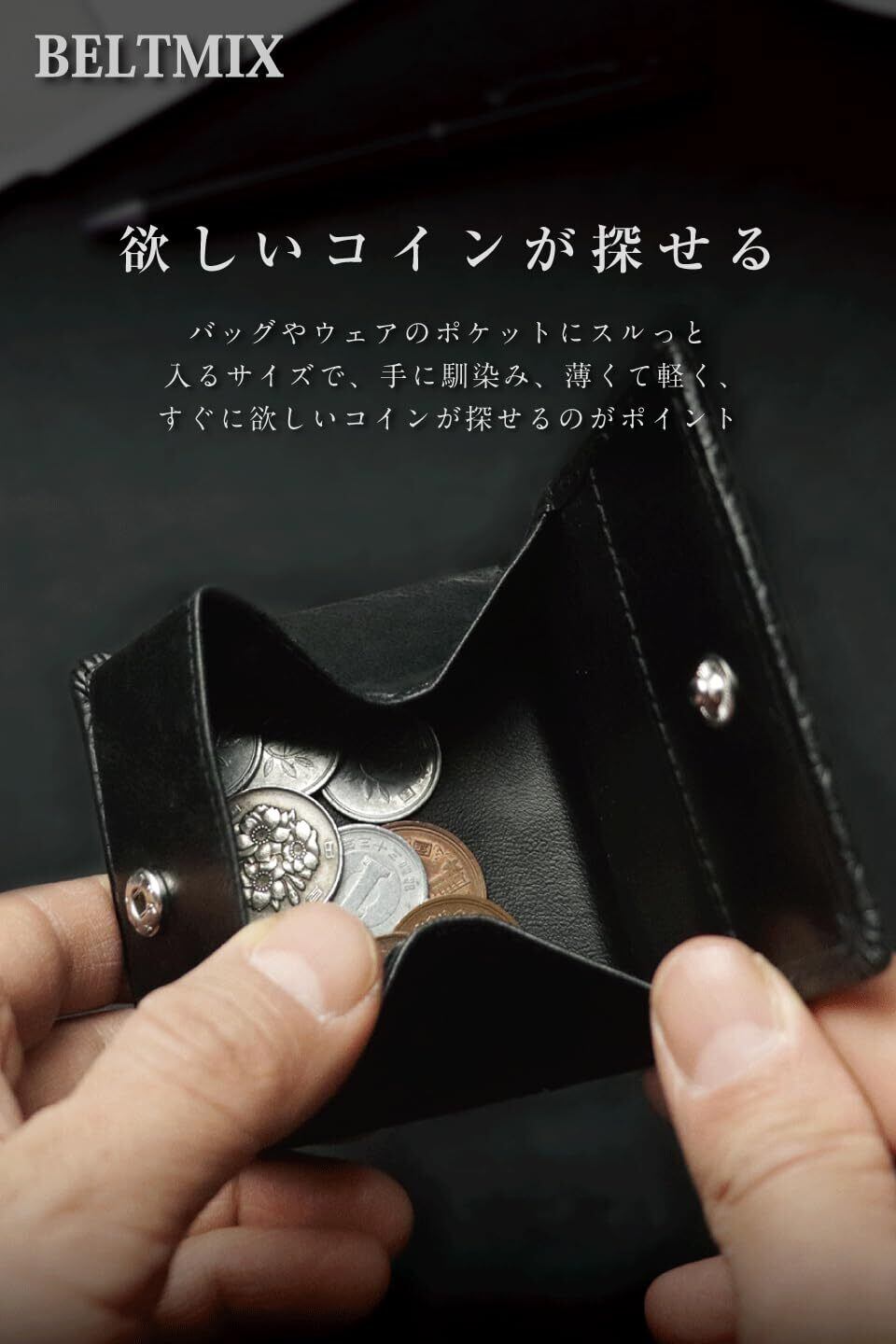 【欲しいコインが探せる】 バッグやウェアのポケットにスルっと入るサイズで、てに馴染み、薄くて軽く、すぐに欲しいコインが探せるのがポイント。