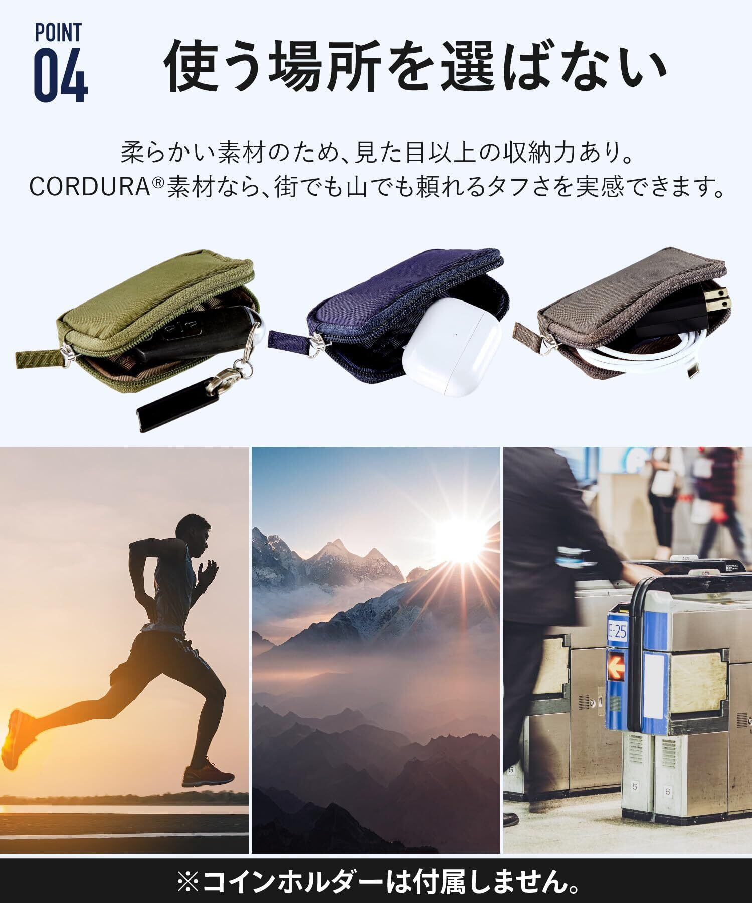【豊富な収納スペース】4つのポケットが付いているため、使い方は様々です!例えば、小さなお財布として使用したり、ワイヤレスイヤホンのケースとして利用したり、充電ケーブルや車のスマートキーを収納したりすることができます。幅広い用途で活躍する便利なアイテムです。