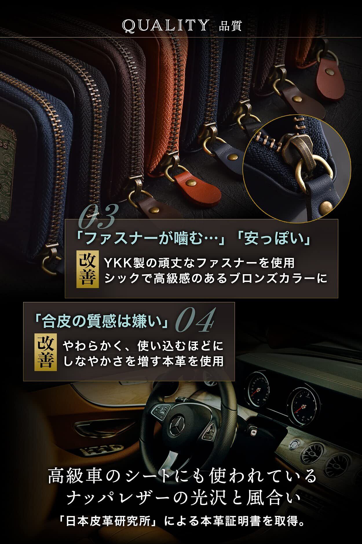 【品質】高級車のシートなどに使用される上質なナッパレザーを採用。しなやかで柔らかく手に馴染み、革本来の風合いと上品な光沢が美しいプレミアムな素材。専門機関による本革鑑定取得済み。