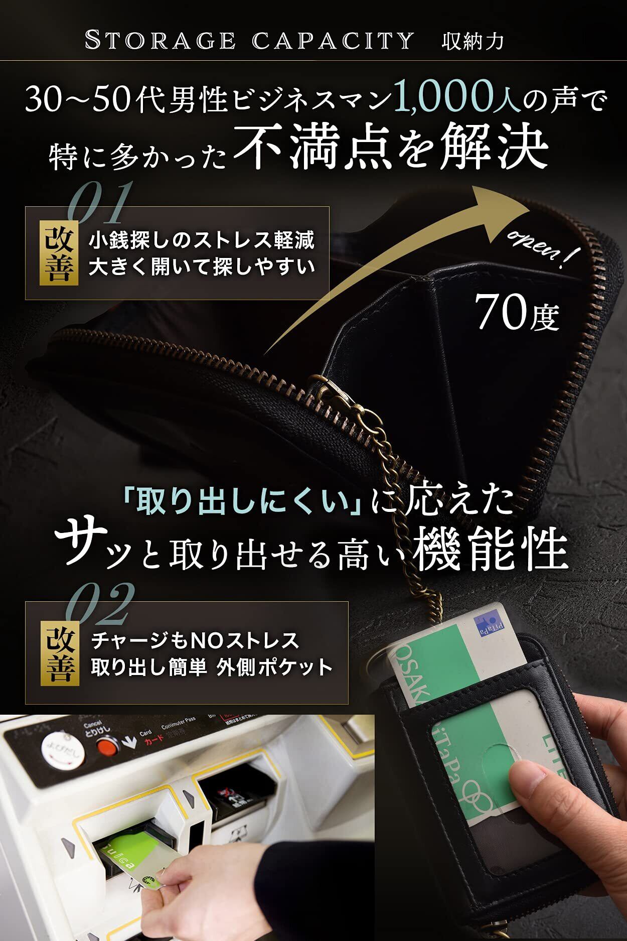 【改善ポイント】大きく開いて中身を探しやすい財布(さいふ)。外側のカード入れ(定期入れ、パスケース)が取り出しやすい。ブロンズカラーのYKK製ファスナーとキーリング(キーチェーン)でスムーズな開閉。