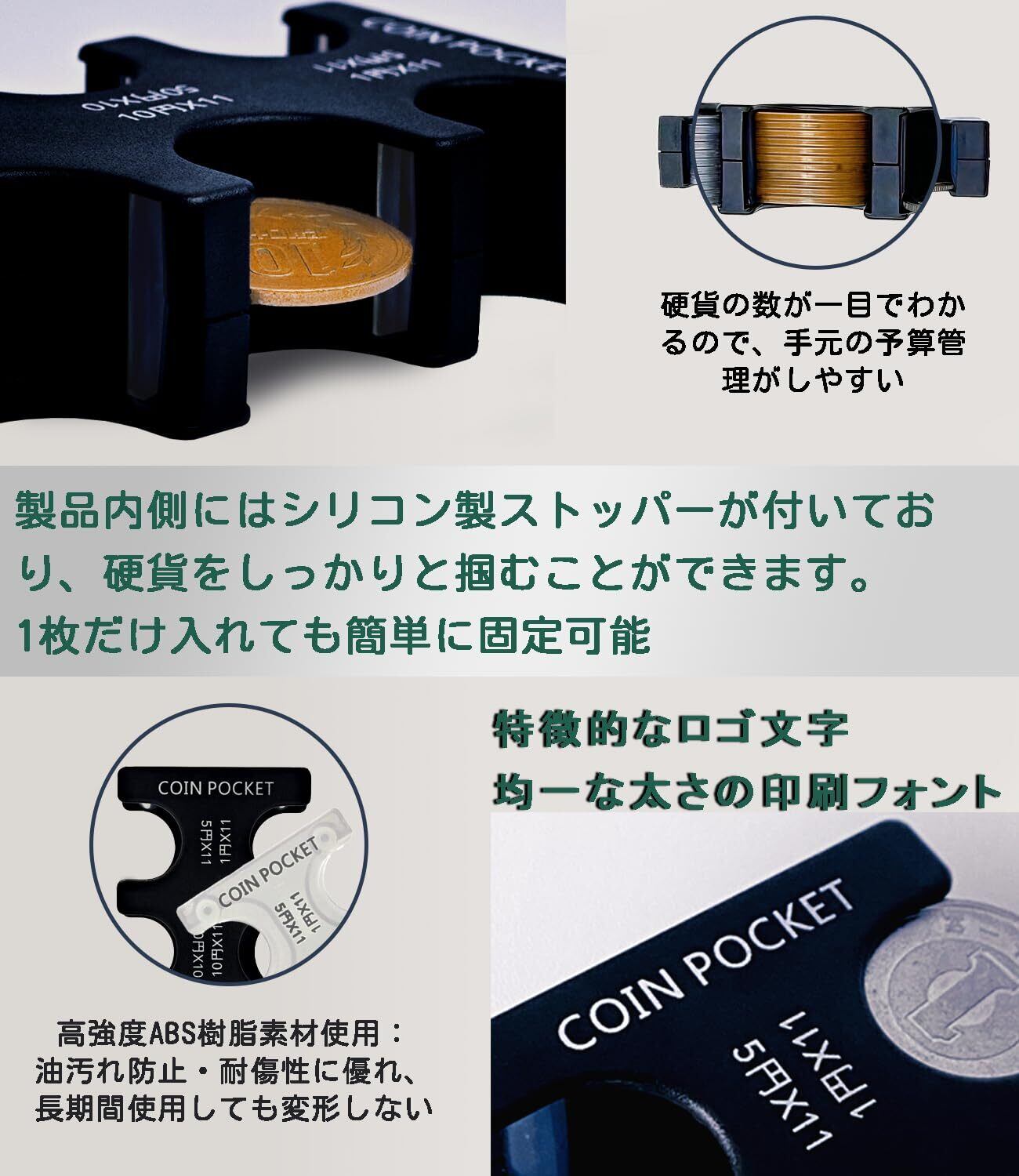 【硬貨の散乱防止】携帯型コインケースにはシリコン製ストッパーを採用。シリコンと硬貨の摩擦力を利用し、硬貨を確実に固定します。収納枚数が最大でも最小でも、走る時の振動や車の揺れにも対応。硬貨が簡単に外れる心配はありません。