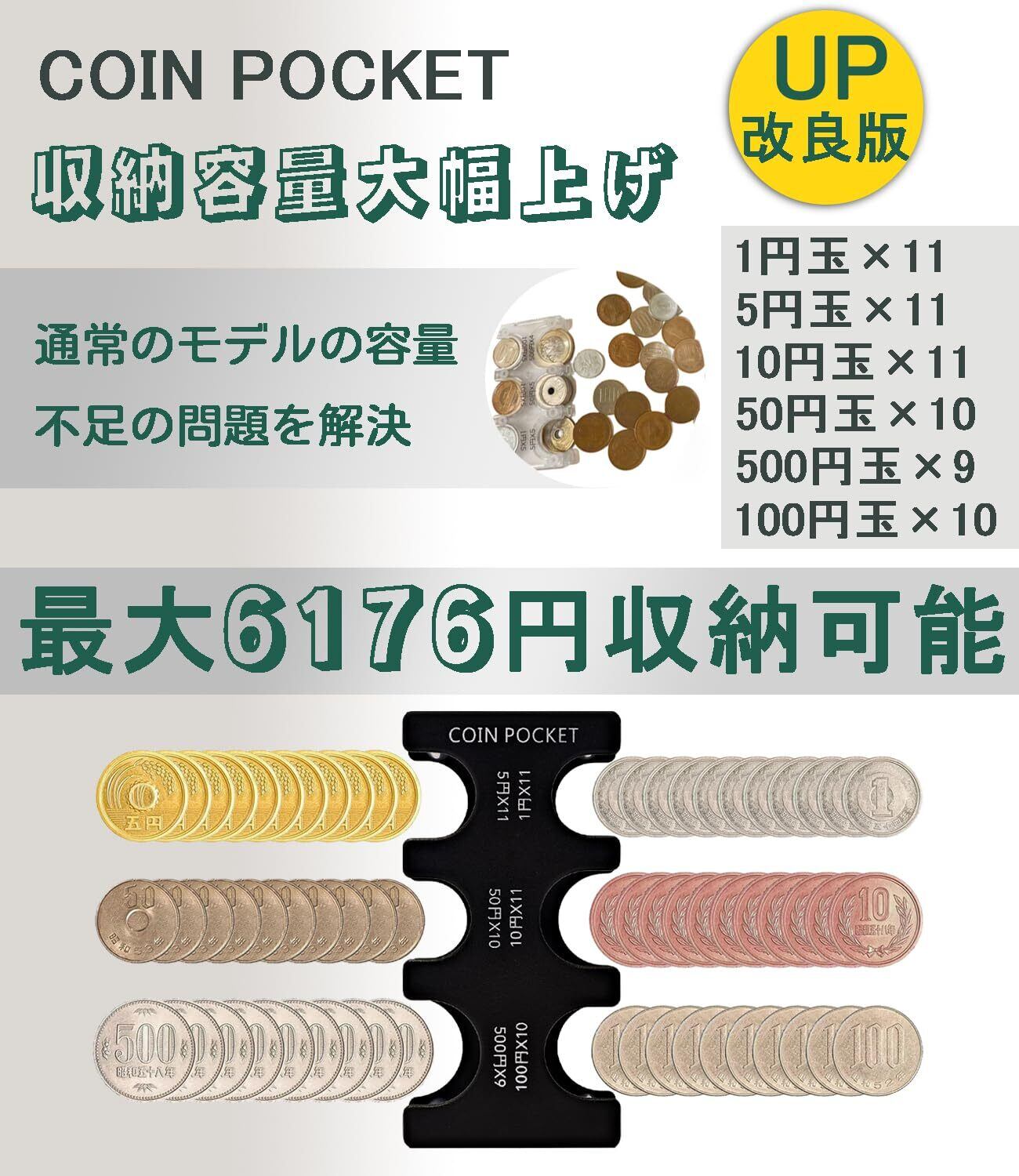 【収納力が大幅アップ】500円×9枚・100円×10枚・50円×10枚・10円×11枚・5円×11枚・1円×11枚(合計6176円)を収納できます。