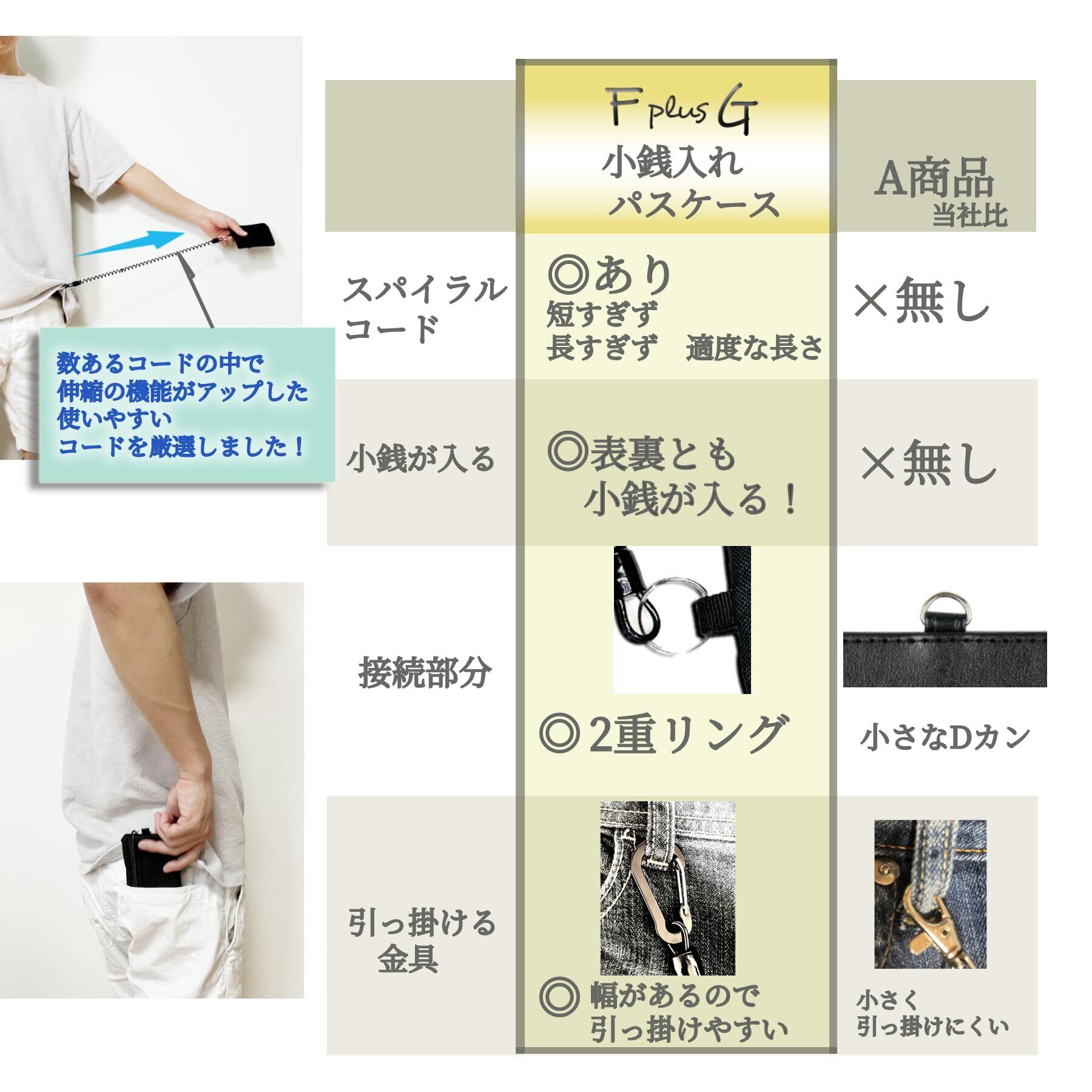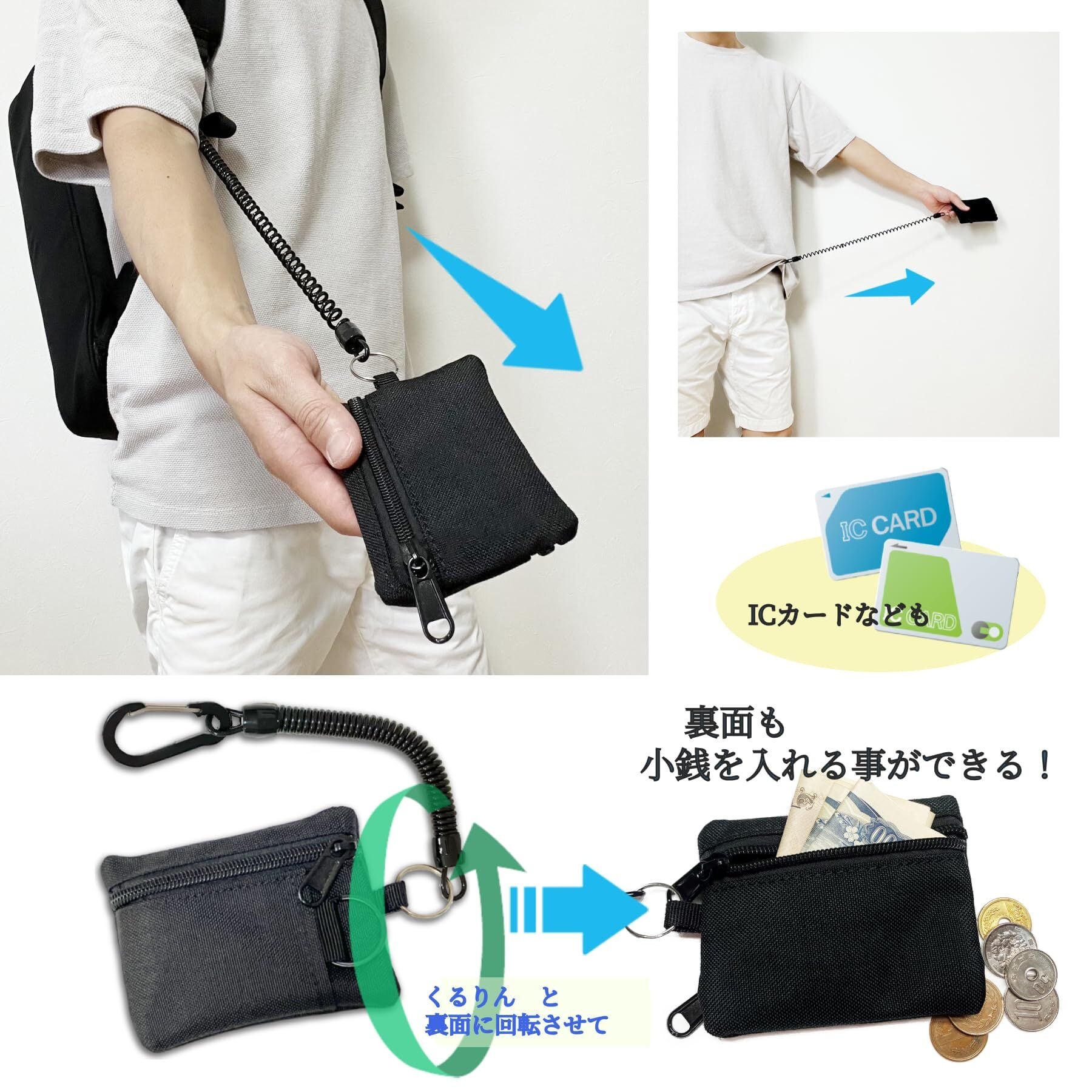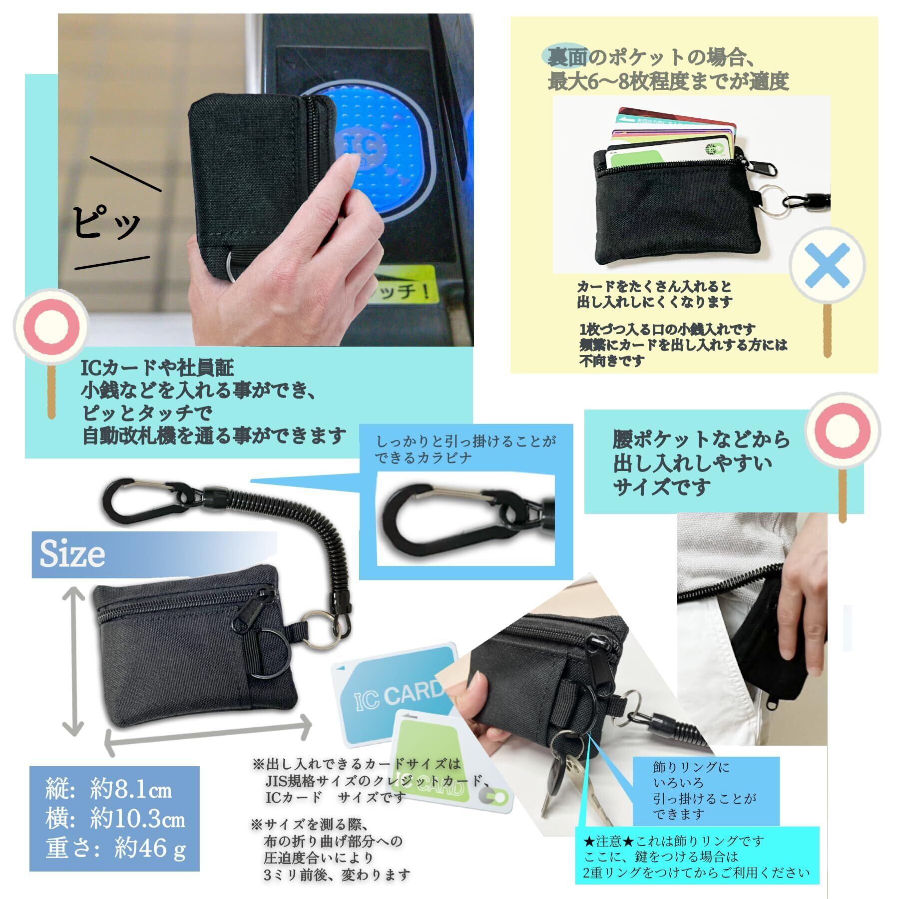 F plus G 定期入れ 小銭入れ コインケース カード ケース キーケース カラビナ付き コード付き パスケース ミニ財布 財布 吊り下げ ミニマリスト パスケース メンズ レディース 伸びる キーリング コード カラビナ コンパクト カード入れ 小銭 (Black)