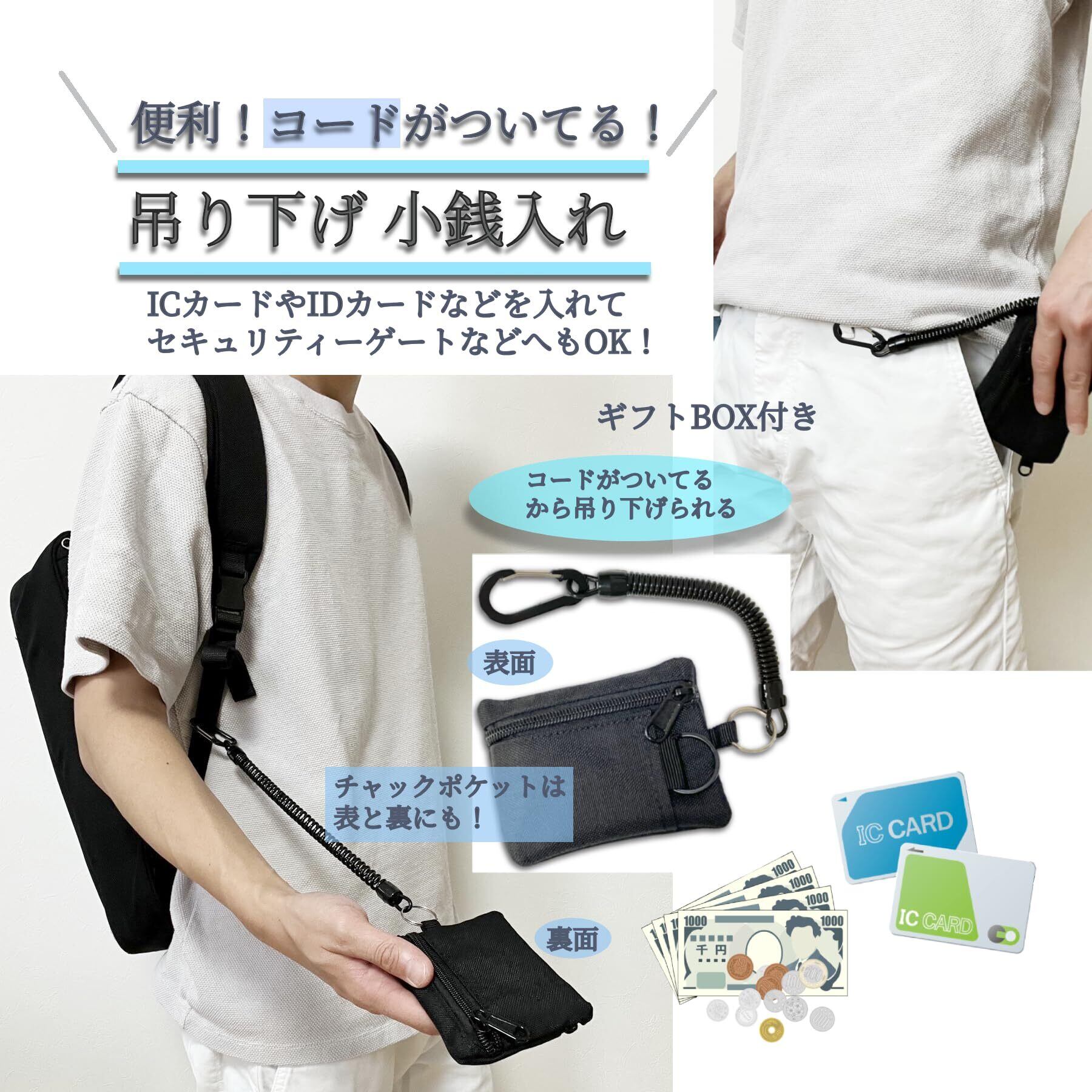 【種類】小銭入れにカラビナとコードが付き 腰ポケットなどに吊り下げてお使いいただけることができます。ギフト箱に入っています。ICカード、IDカードなども入れることできるのでセキュリティーゲートを通るときや、社員証をかざすときなどのシーンにもお使いいただける便利な小銭入れです。