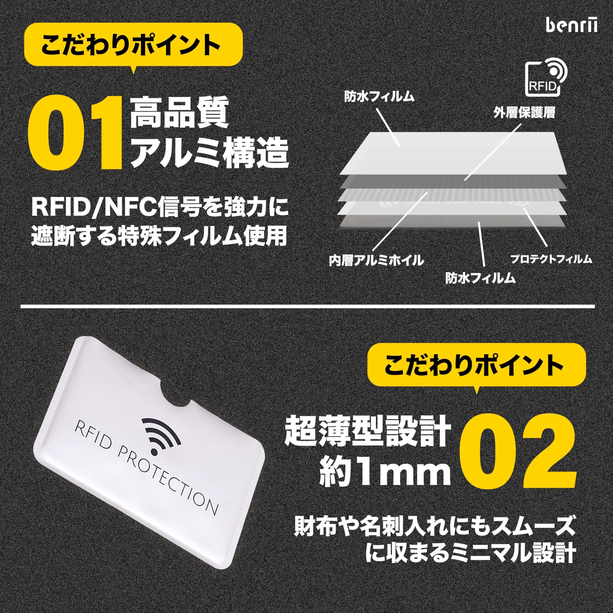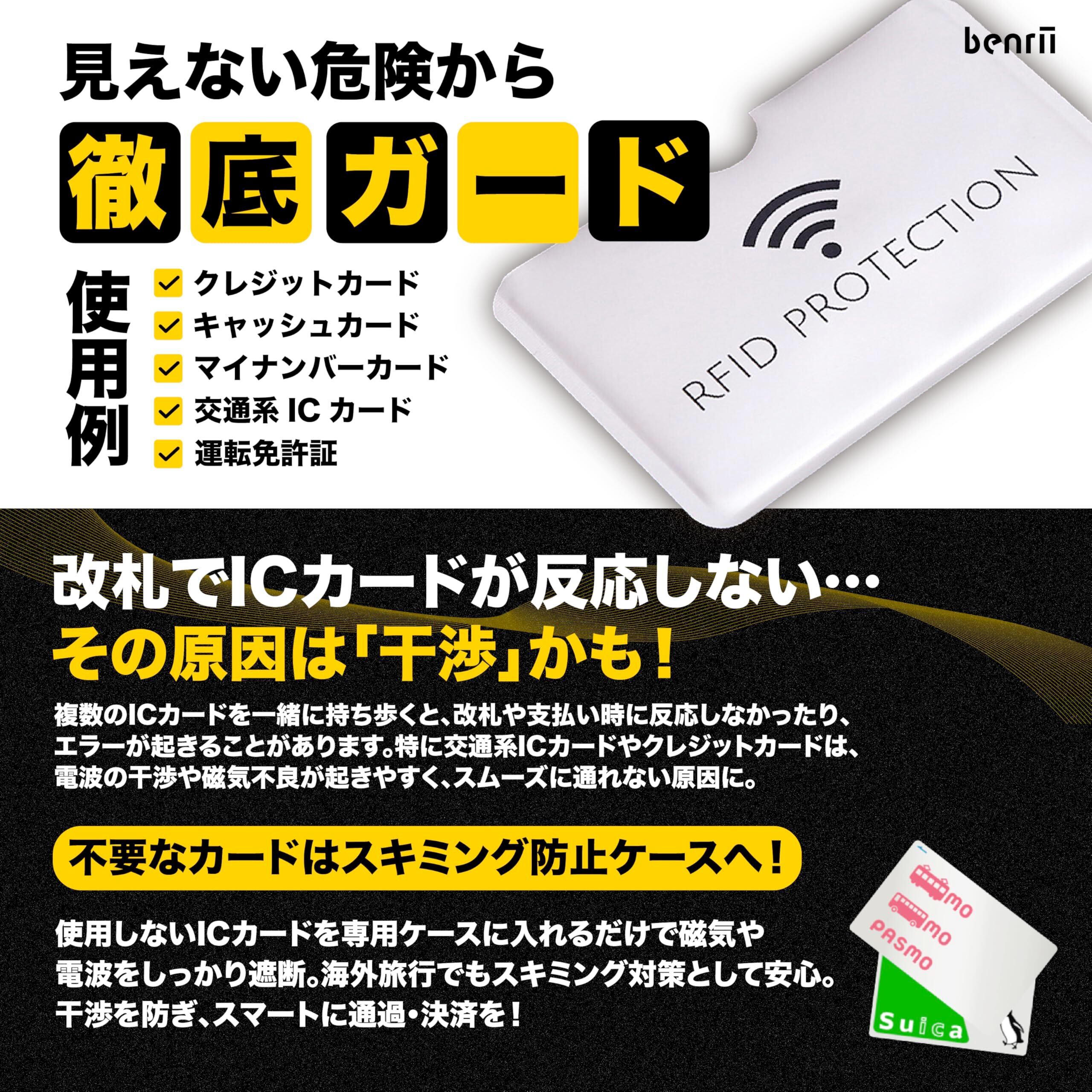 【セキュリティ面】benriiスキミング防止ケースはクレジットカード情報や交通系ICの不正読み取り、情報漏洩を防止! 【機能性・使いやすさ】benriiスキミング防止ケースはスリムで財布に入れやすい! 【利用シーン様々】benriiスキミング防止ケースは 海外旅行や出張、通勤通学の際にスキミング対策としてはもちろん、使っていない交通系ICを入れておけば反応しなくなります。 【デザイン性】benriiスキミング防止ケースは シンプルで洗練されたデザイン!商品サイズは約9.3cm×6cm 【安心の国内企業】benriiは安心安全の国内企業。1年間の保証付き!