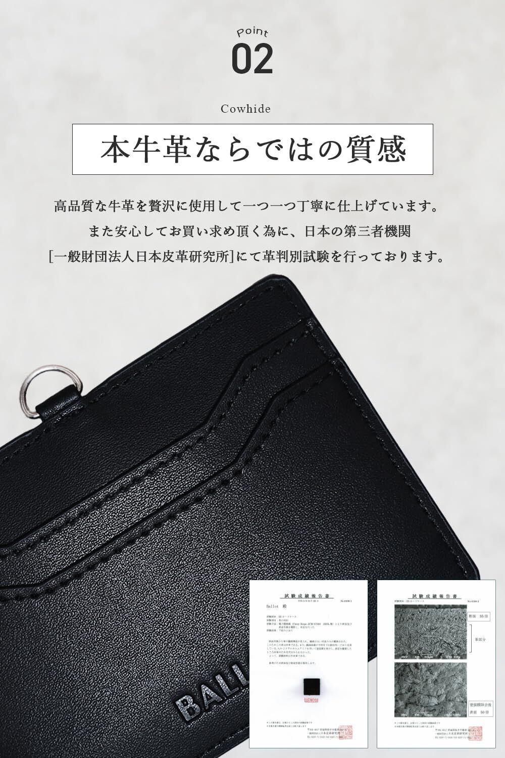 【本牛革ならではの質感】BALLOTのIDカードホルダーは、高品質な本牛革を使用し、一つひとつ丁寧に仕上げています。牛革特有の滑らかな手触りと耐久性が特徴で、長く愛用していただける一品です。さらに、日本の第三者機関「一般財団法人日本皮革研究所」にて革の判別試験を実施しており、品質の確かさが保証されています。洗練されたデザインと本革の上品な質感が、ビジネスシーンでの信頼感を演出します。