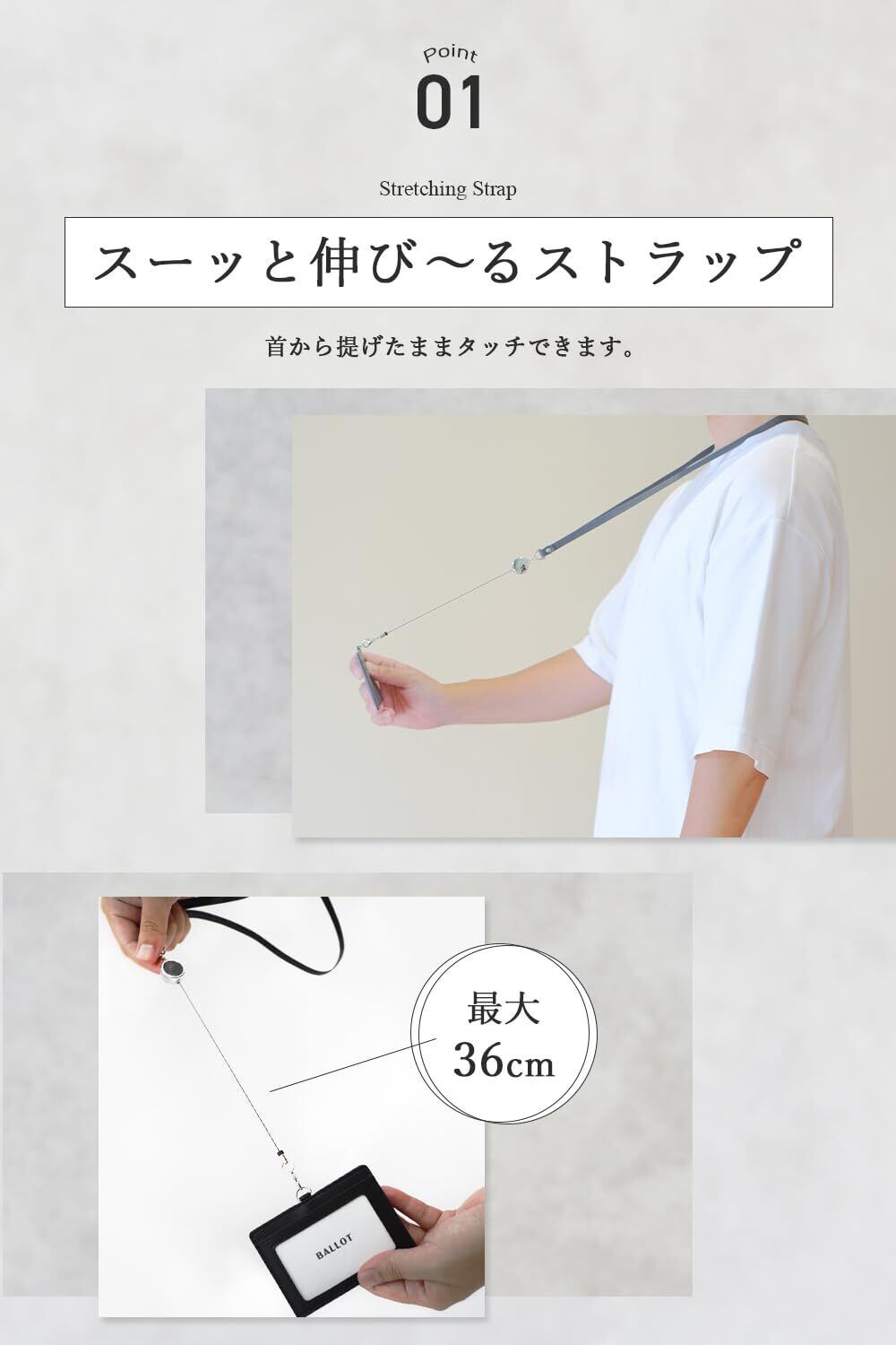 【スーッと伸びるIDカードフォルダー】ビジネスシーンや日常での使い勝手を追求した、伸縮リール付きIDカードホルダーです。リールは最大36cmまで伸びるため、ICカードキーや社員証を手軽にタッチすることが可能。首に掛けたままでもリールがスムーズに動くので、ストレスフリーで操作できます。デザインと機能性を両立した使いやすいアイテムです。