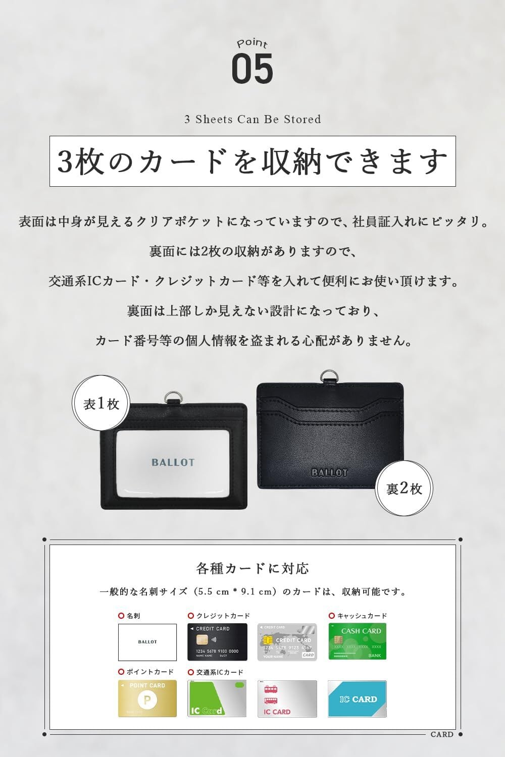 【3枚のカード収納】表面は透明なクリアポケットになっており、社員証やIDカードをすぐに確認できます。裏面にはさらに2枚のカードが収納可能で、交通系ICカードやクレジットカードを入れておけば、持ち物がコンパクトにまとまります。また、裏面のデザインは上部のみが見える仕様になっており、カード番号や個人情報が外から見られる心配も軽減。安心して使える設計が魅力です。