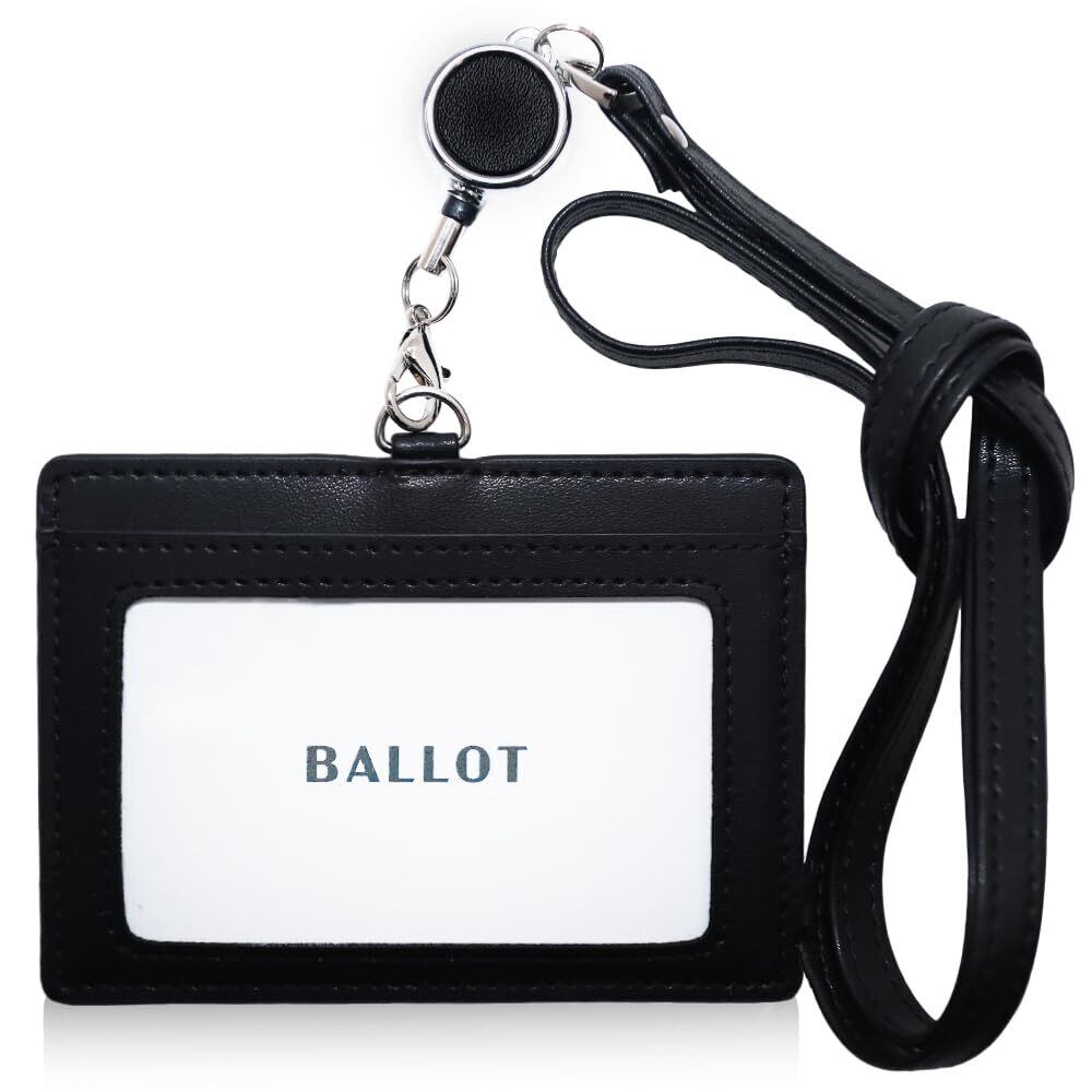 BALLOT [スーッと伸び〜る] 本革 IDカードホルダー ネームホルダー 横型 パスケース ネックストラップ 伸縮リール付き (ブラック)
