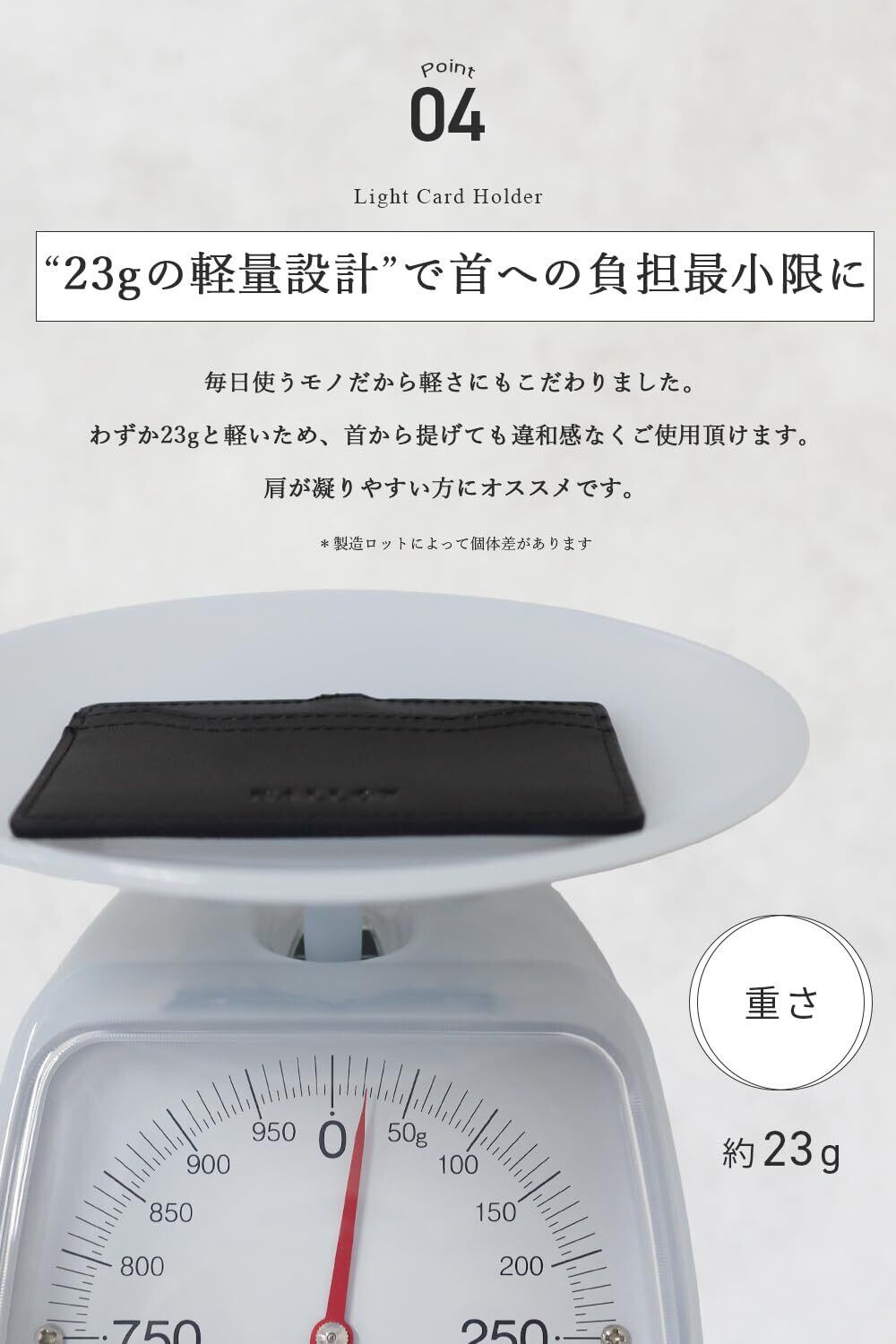 【23gの軽量設計】重さはわずか23gと非常に軽量で、首から提げていてもほとんど負担を感じません。長時間の使用でも肩や首への負担を軽減し、特に肩こりにお悩みの方におすすめです。日々の仕事や移動中に快適な使い心地を提供するデザインです。