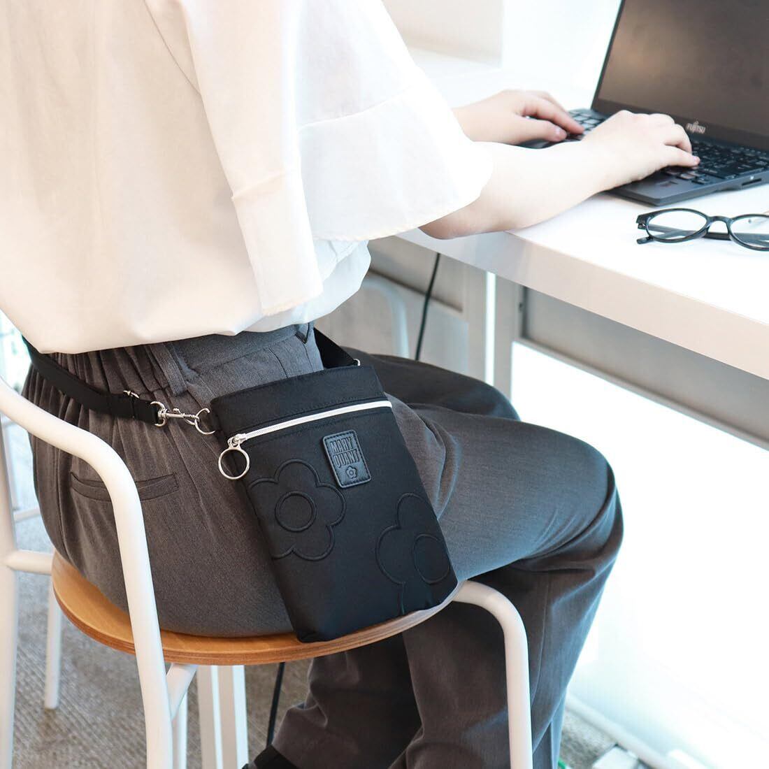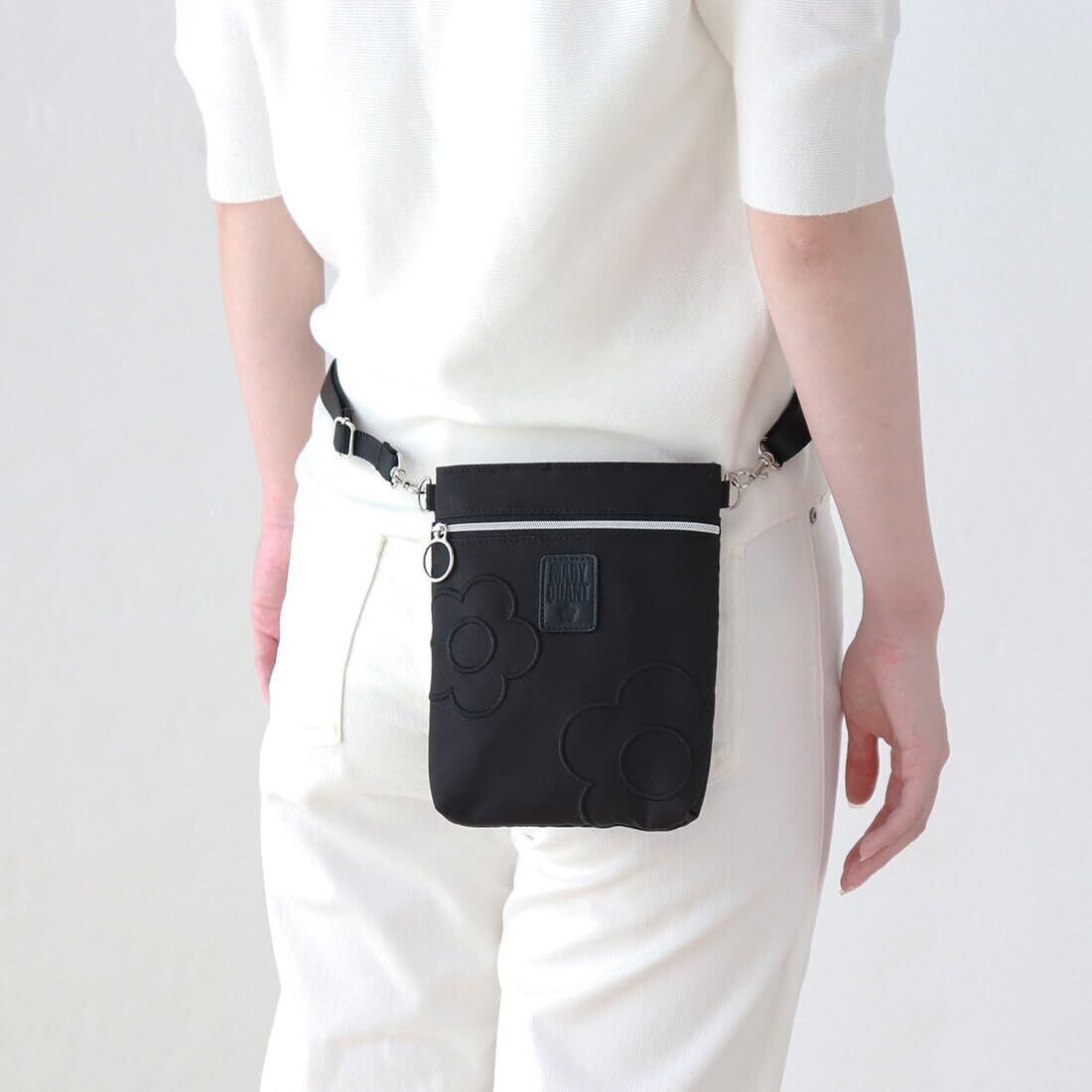 【MARY QUANT ショルダーポーチ】アイコン“デイジー”がポイントのシンプルなデザイン。コンパクトなサイズのショルダーポーチです。いつもの服にポケットをプラスする感覚で気軽に使える便利なポシェットは、ベルトの長さを調整することで、ウエストポーチにもショルダーポーチとしても活用できる2WAY仕様です。
