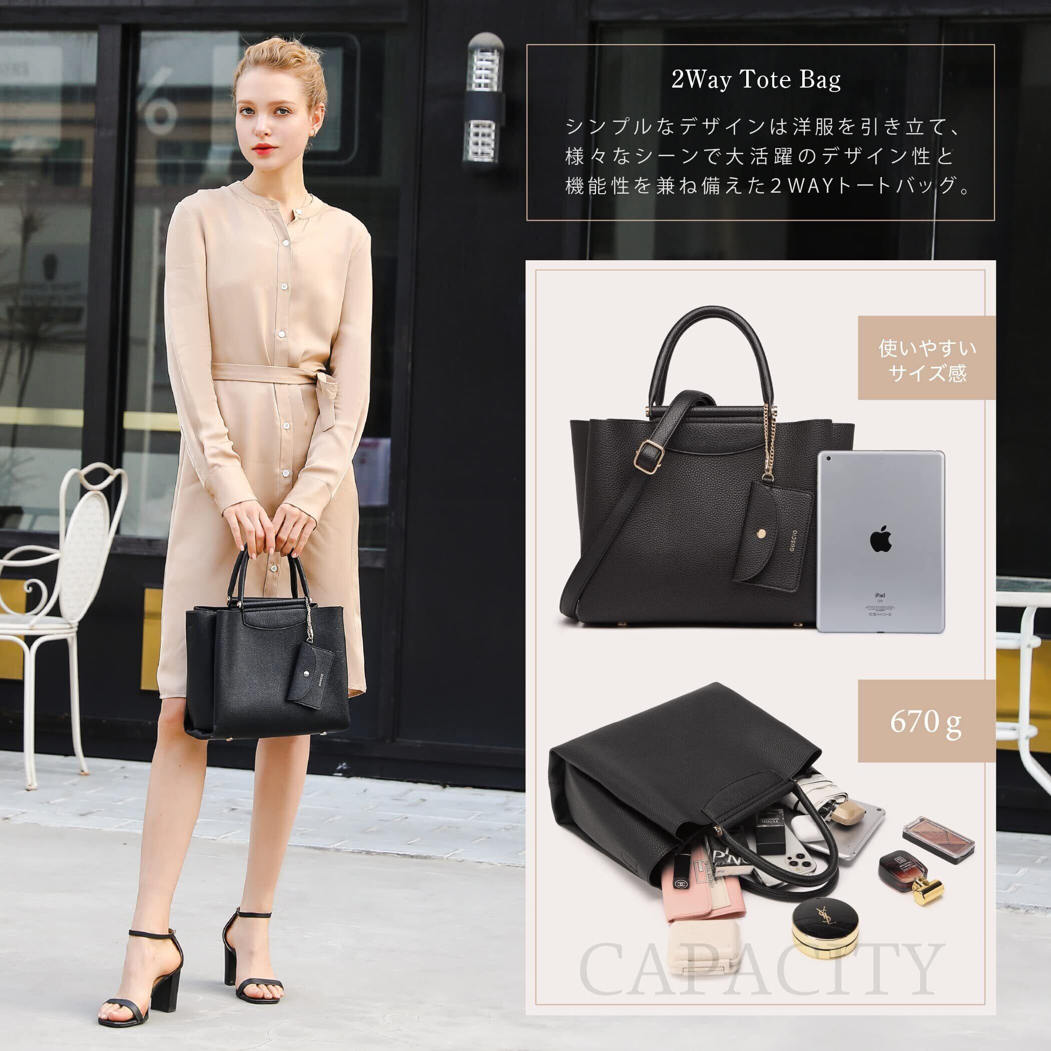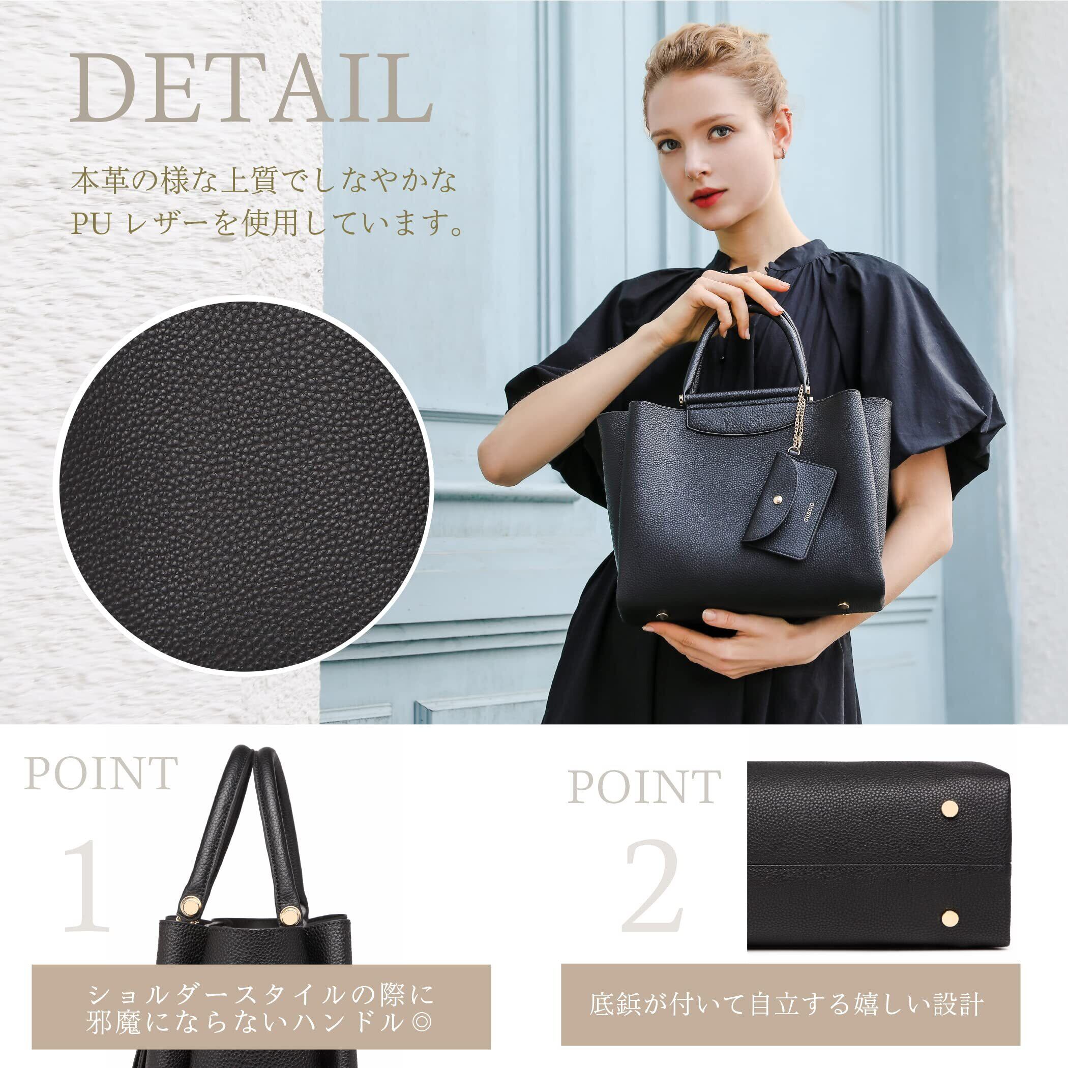 シンプルなデザインは洋服を引き立て、様々なシーンで大活躍のデザイン性と機能性を兼ね備えた2WAYトートバッグ。 ①バーハンドルはショルダースタイルの際にハンドルが邪魔にならず使いやすい。②便利なあおりポケットは荷物の整理がしやすい。③素材は本革の様な上質でしなやかなPUレザーを使用④しっかりと広めのマチはお弁当やペットボトルも入るサイズ感。⑤自立でき、底鋲があるのも嬉しいポイント。