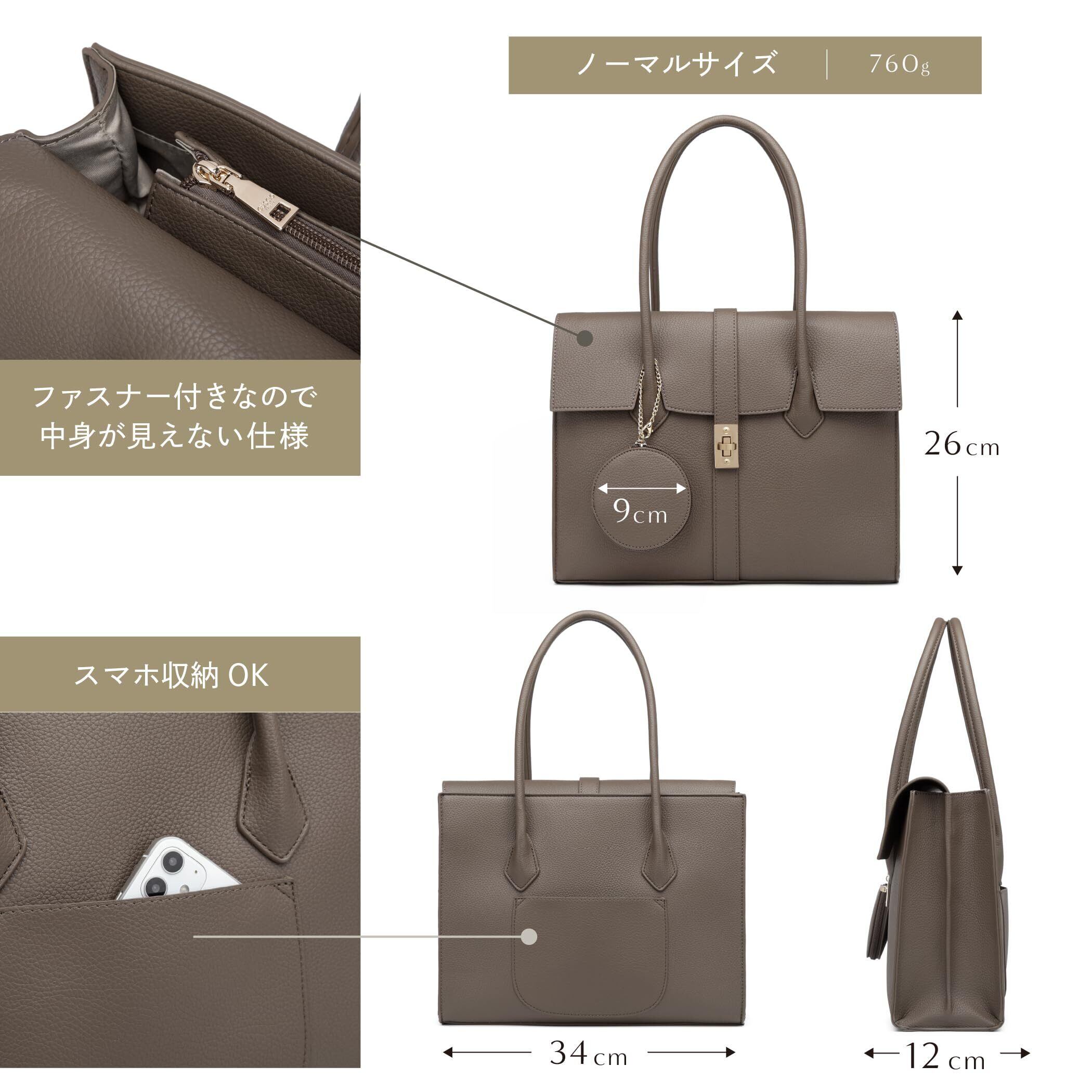 幅:上部 約34cm 、 高さ(中央部):約26cm、 マチ:約12cm、 ハンドル:長さ 58cm 高さ 16cm 重量:760g 付属ポーチ:直径 9cm 、マチ 1.5cm 、チェーン長さ 17cm、 【開閉部】ファスナー、 【 内側ポケット】ファスナーポケット、オープンポケット×2 【外側ポケット】正面かぶせポケット、背面オープンポケット 【素材】PUレザー