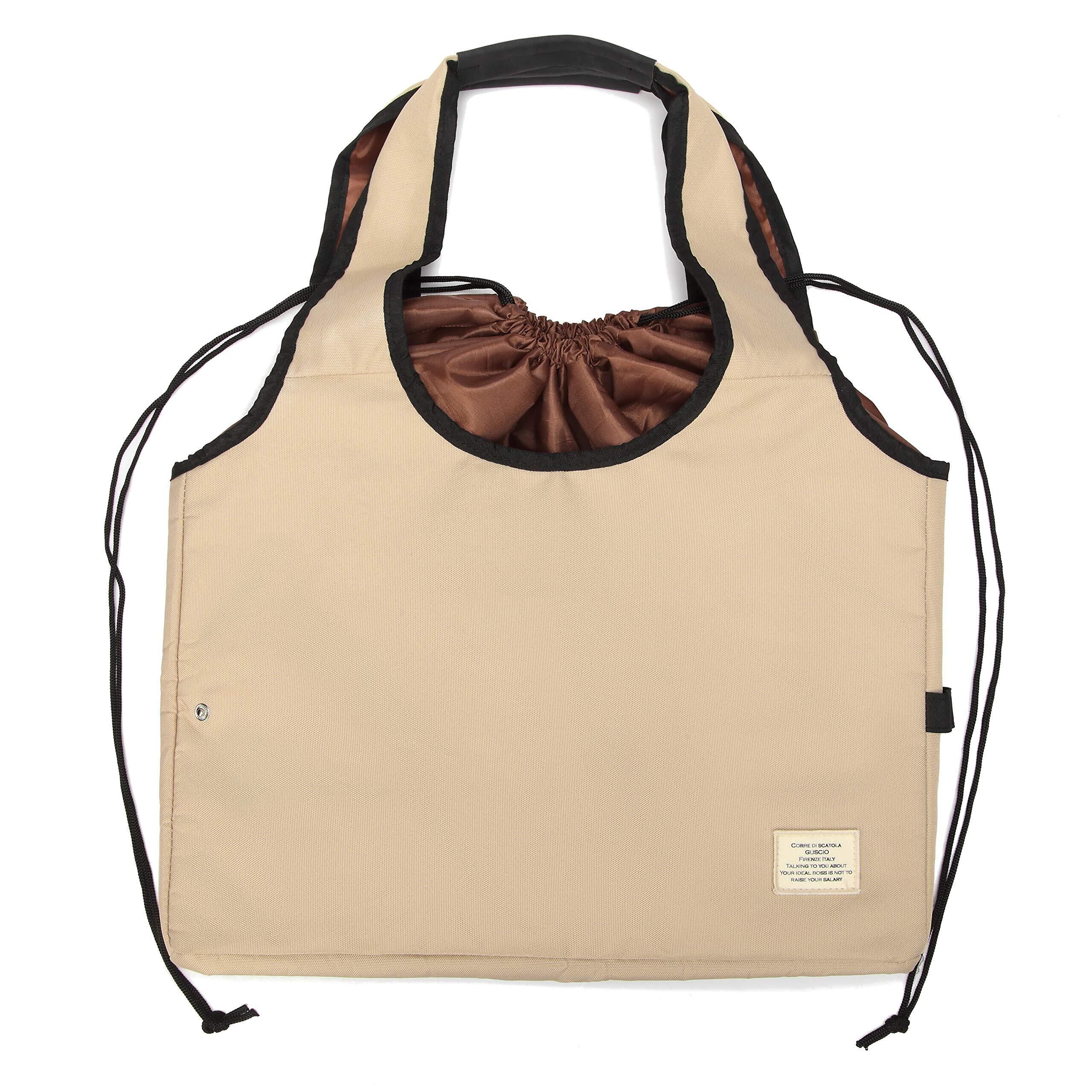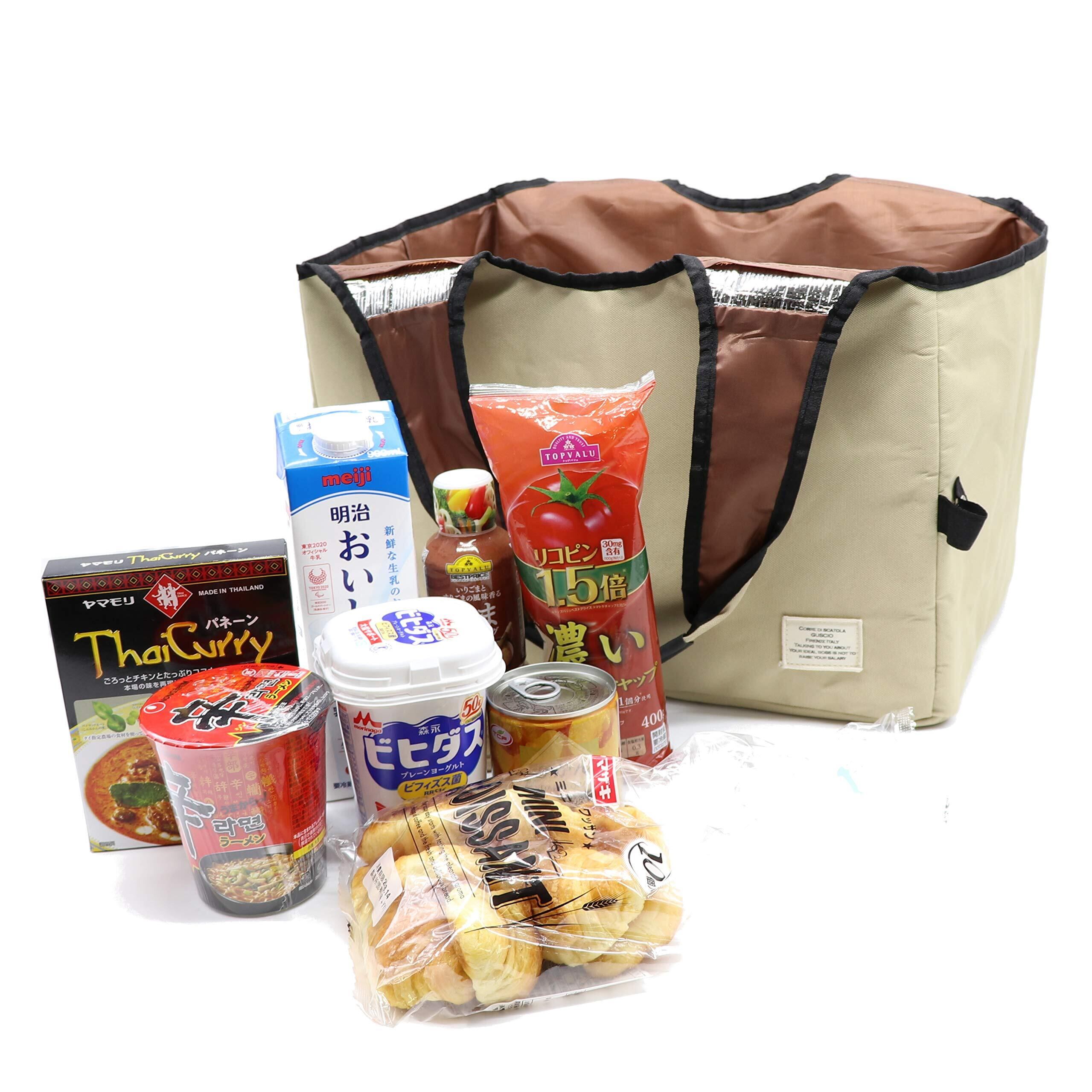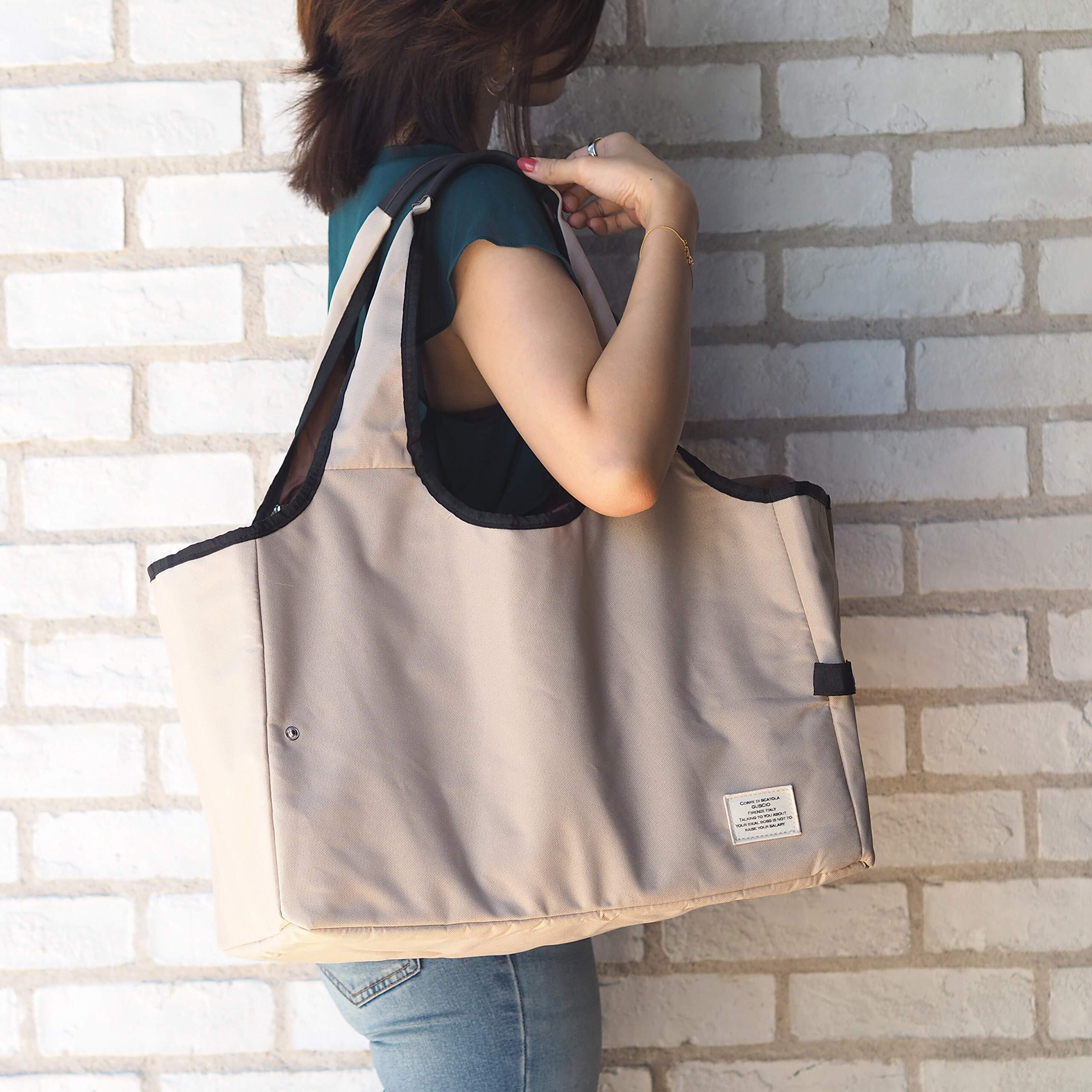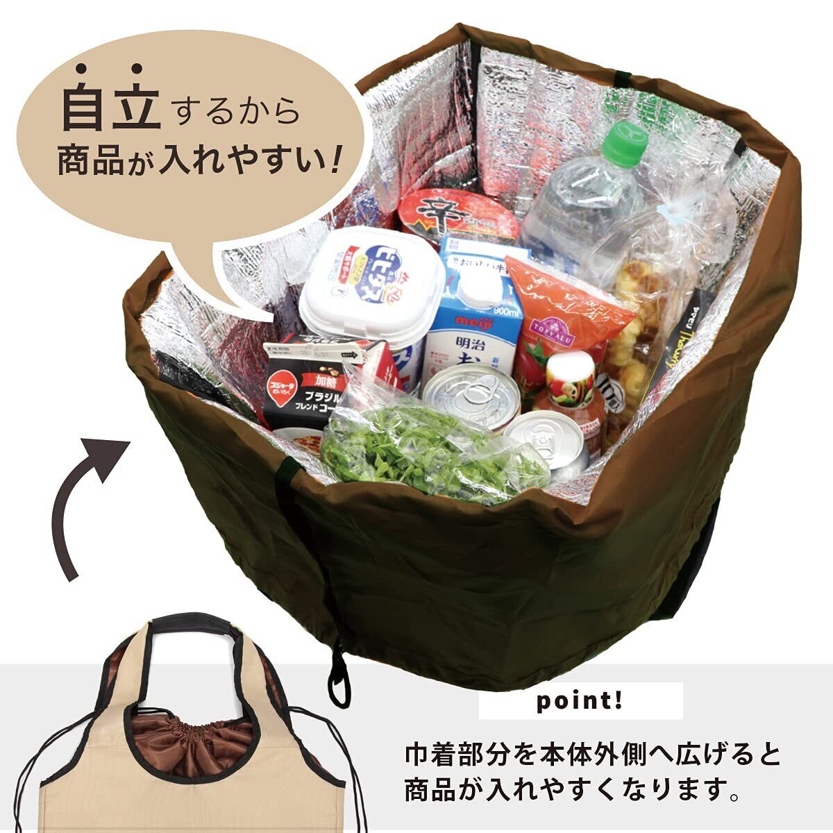 ①スーパーなどでお会計時にレジかごの中にセットすれば詰め替えせずにそのまま持って帰る事が出来ます。お買い物時の時短にも役立ちます! ②本体生地と内側の巾着生地がバイカラーにする事によりお買い物バッグもおしゃれに持つ事が出来ます。 ③バッグのハンドルもくり手のデザインで肩に掛けやすいでデザインになっておりハンドル上部にはPUレザーを使うことにより持ちやすくなっています。 ④内側にはアルミ蒸着シートを使用し保冷保温効果があります。