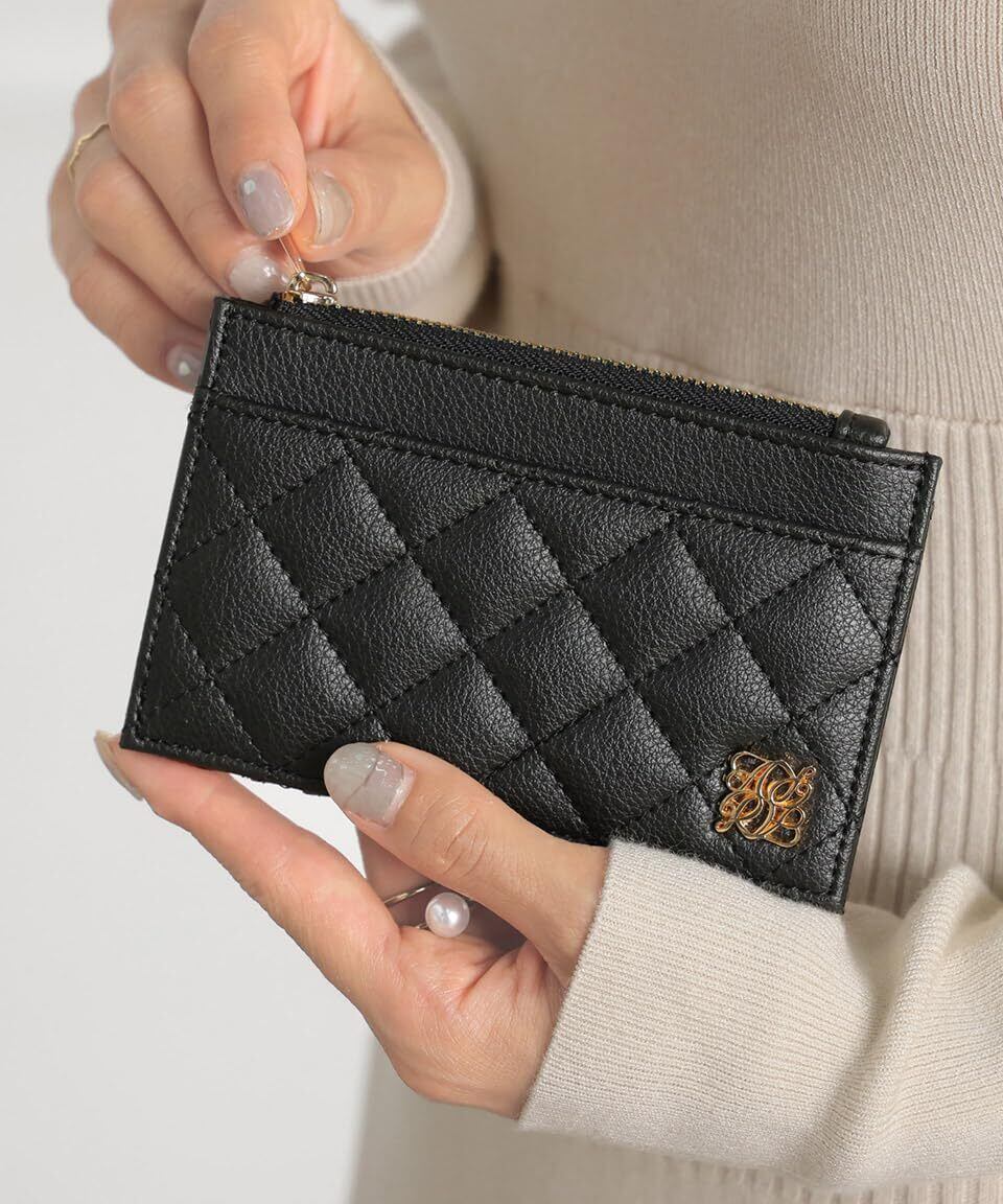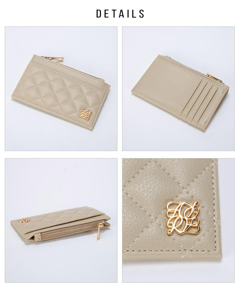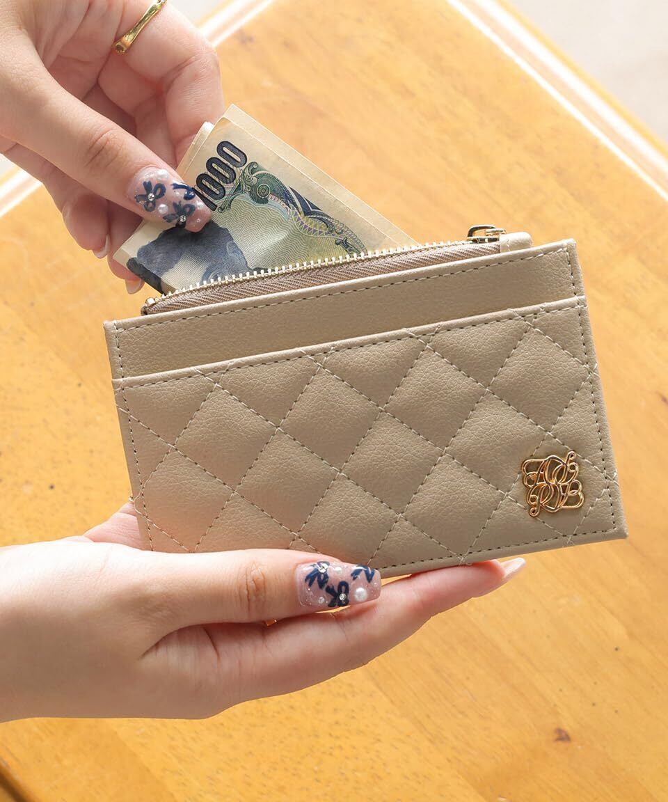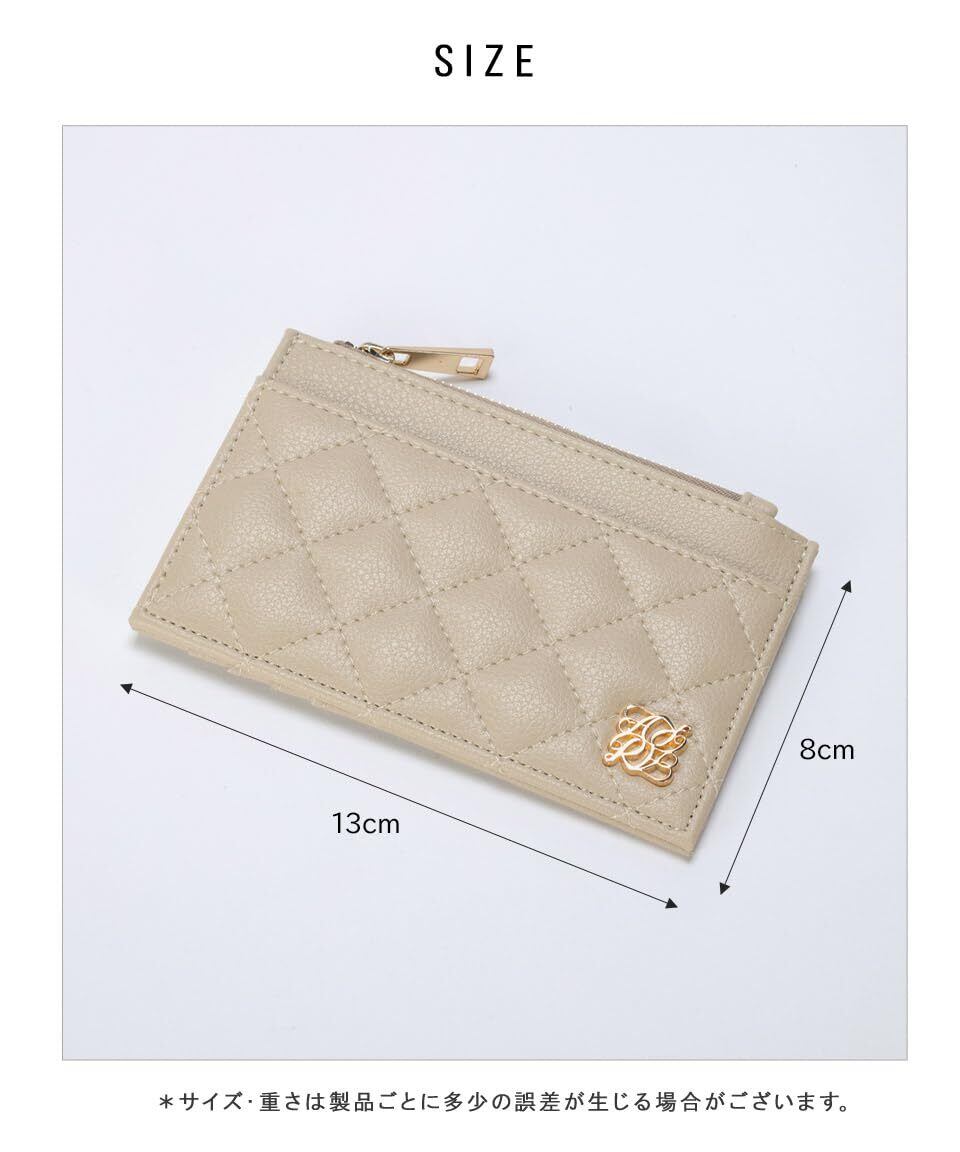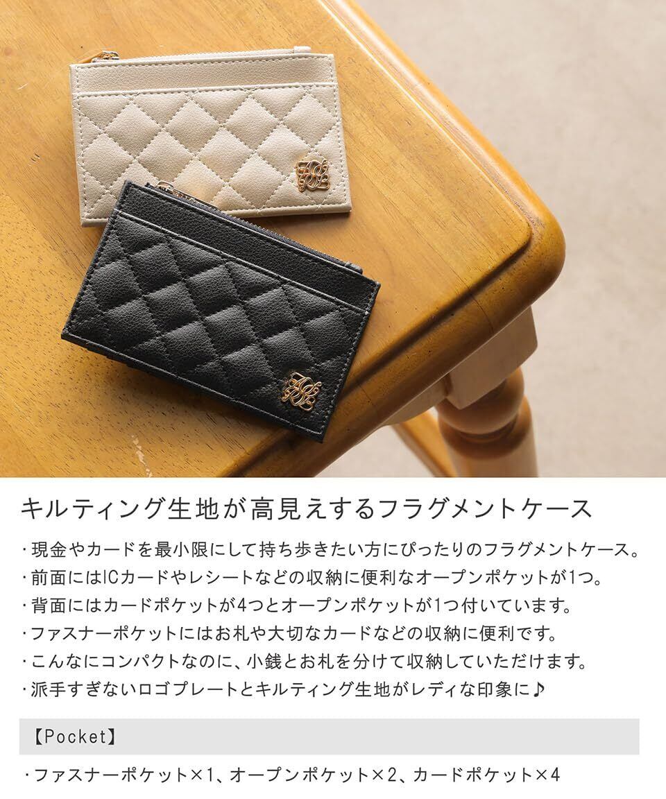 ・現金やカードを最小限にして持ち歩きたい方にぴったりのフラグメントケースです。・前面にはICカードやレシートなどの収納に便利なオープンポケットが1つ付いています。・背面にはカードポケットが4つとオープンポケットが1つ付いています。・ファスナーポケットにはお札や小銭、大切なカードなどの収納に便利です。・こんなにコンパクトなのに、小銭とお札を分けて収納していただけます。・派手すぎないロゴプレートとキルティング生地がレディな印象に
