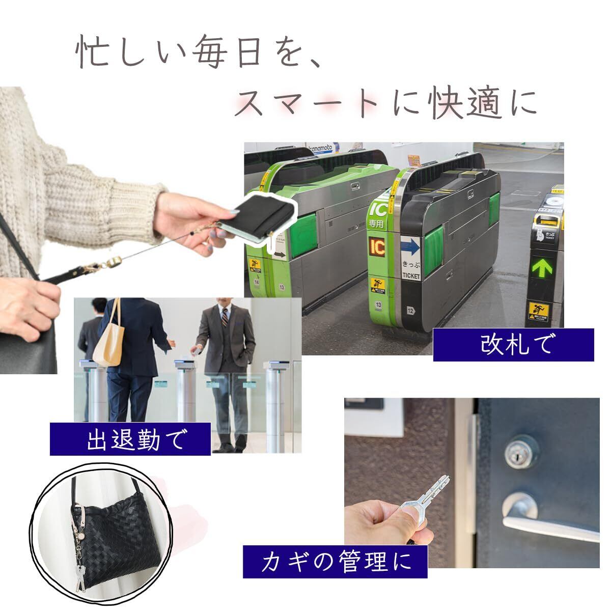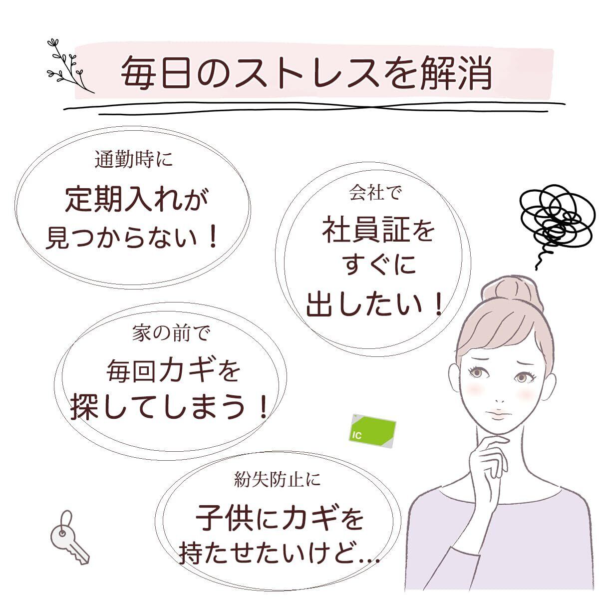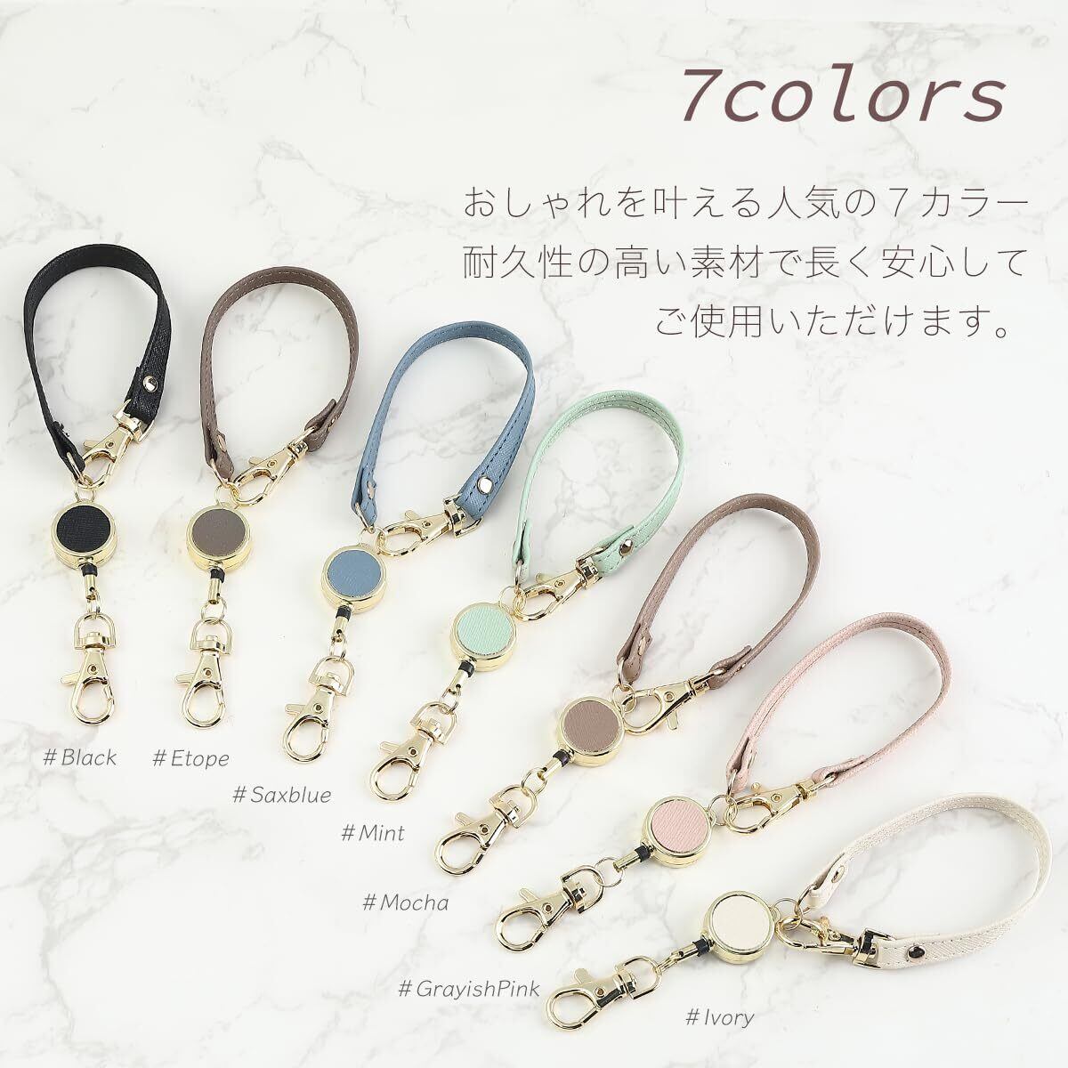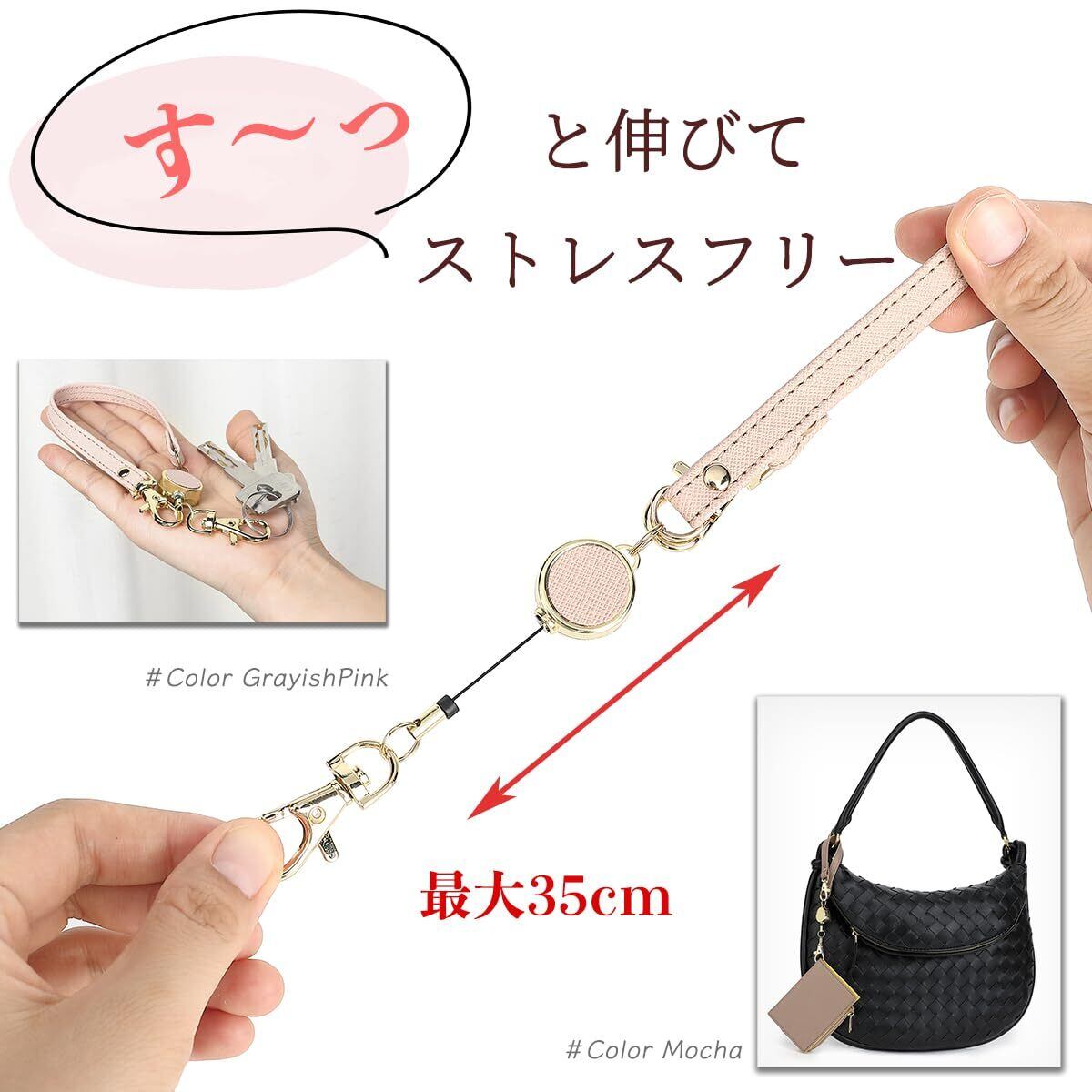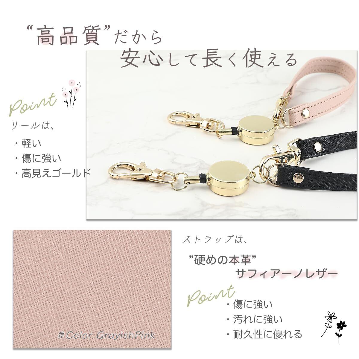 外出時にパスケースや鍵に付けて、さっと取り出しパッと使える、便利なリール付きストラップです。