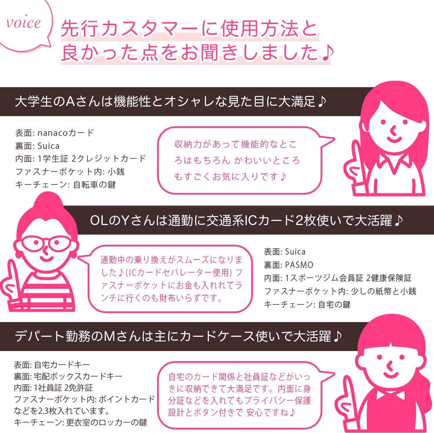 【 4面5ポケットで個人情報もしっかりガード 】 カードは4面にそれぞれ収納可能。表面・裏面はカード内容が人から覗かれないプライバシー保護設計タイプ。 無意識に持ち歩いている時やトートバッグなどカバンに付けてもOK。内面の2つのポケットはスライド式のクリアポケットになっているので 免許証や社員証などを入れるのにも適しています。またマチ付きファスナーポケットに入り切らないカードを入れることも可能です!