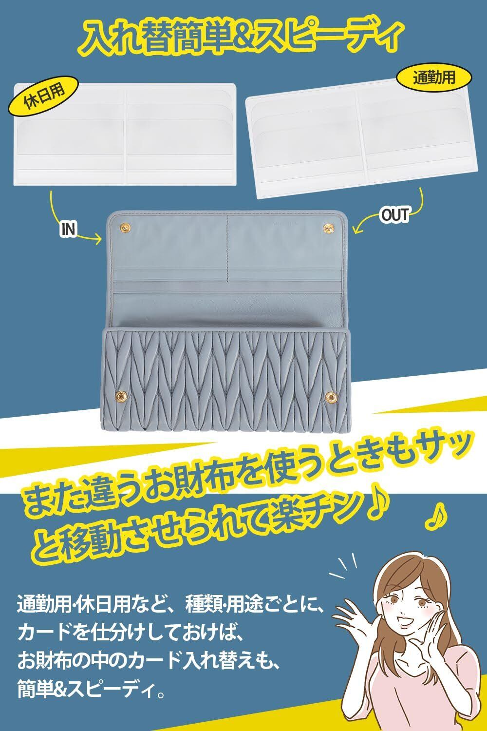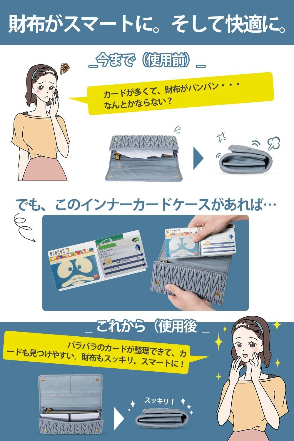 【 出し入れらくらく! 】 ▶カードをサッと取り出せて、お買い物もスピーディなお手持ちの長財布に入るカードケース。ポケット部が半透明で見やすく、見た目もスッキリ探しやすく、お会計もスムーズ。