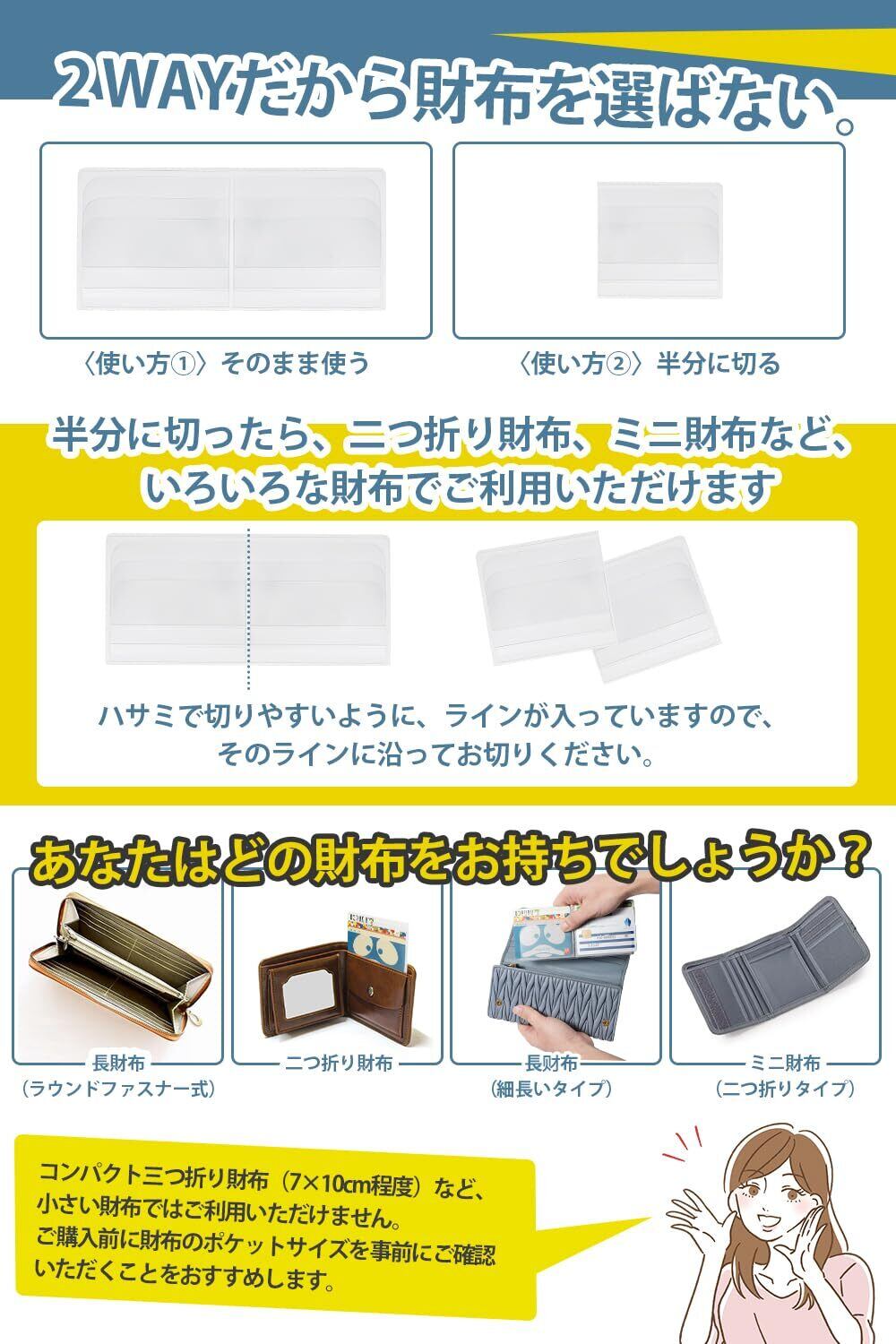 【 半分サイズでも使える2WAY仕様 】 ▶ 二つ折り財布やミニ財布にも対応できるよう、中央のラインに沿って半分のサイズにカットして使用できる2WAY仕様を採用。 長財布、二つ折り財布、ミニ財布、マネークリップなど、さまざまな財布に対応可能。