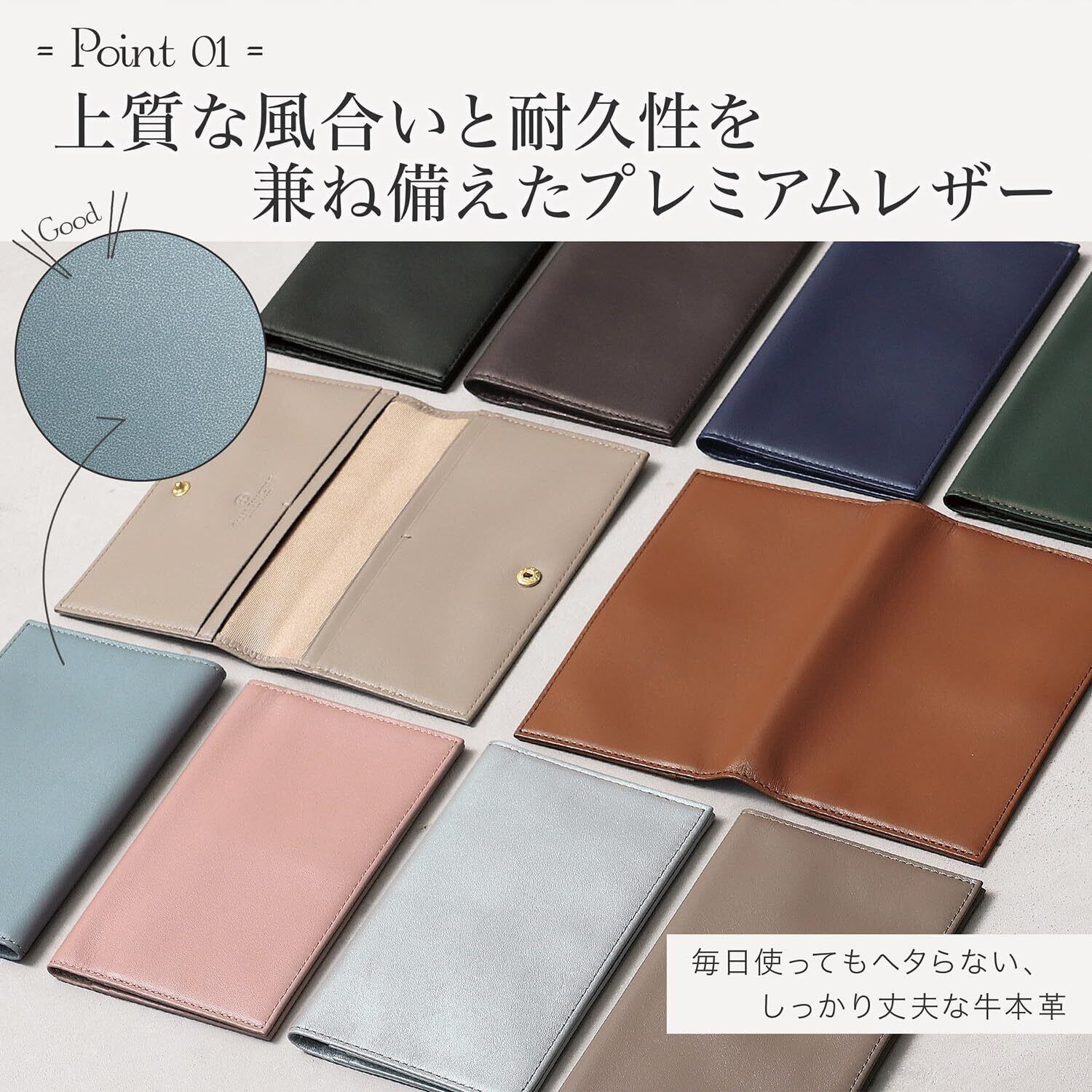 【収納】メインポケット:2 カードポケット:4 【 サイズ 】 縦15 × 横10 × 厚み0.5cm(閉じた状態) 【 素材 】 牛本革 プレミアムレザー(混合鞣し)