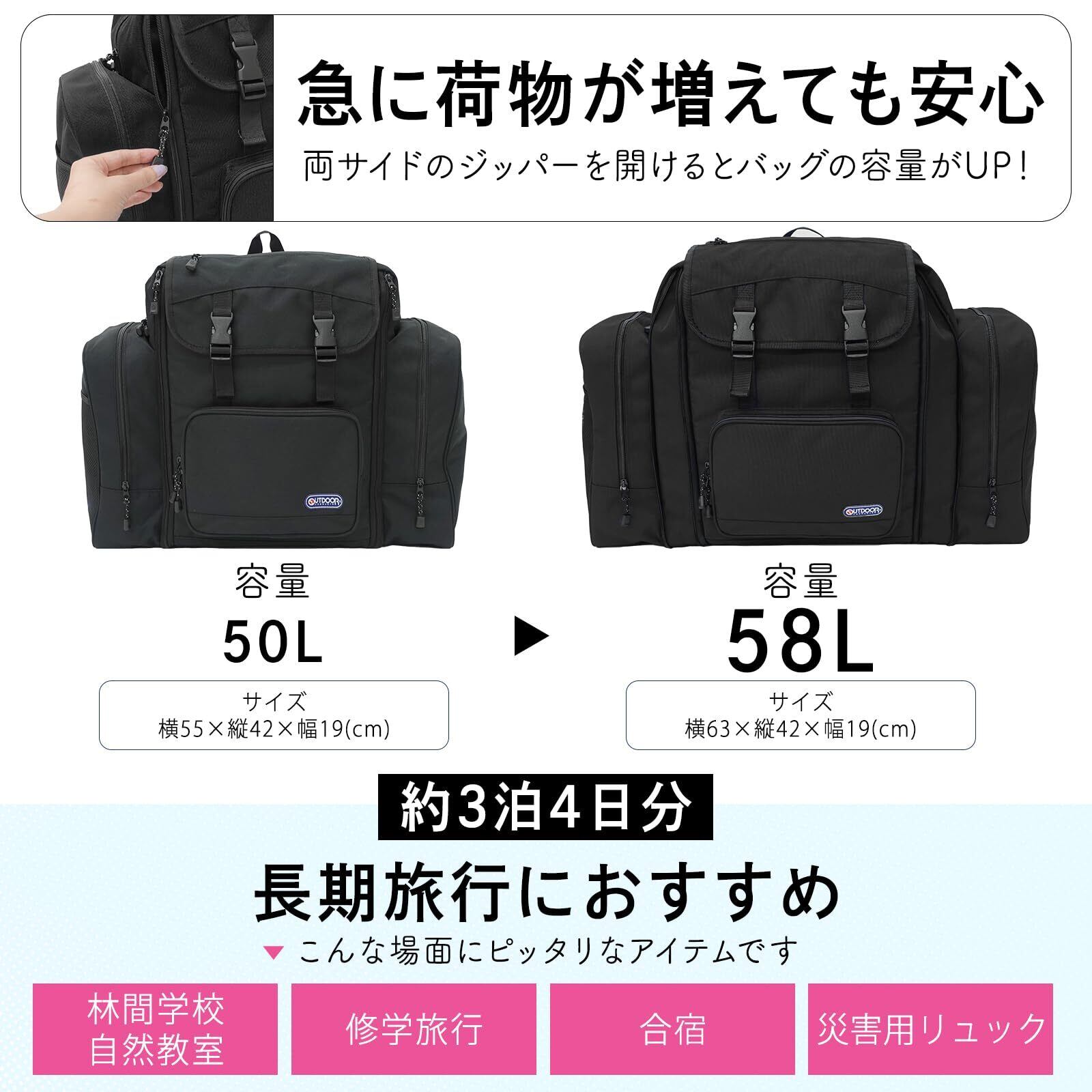[アウトドアプロダクツ] リュック 林間バッグ 大容量 拡張 伸長 修学旅行 キャンプ 無地 ルミナス