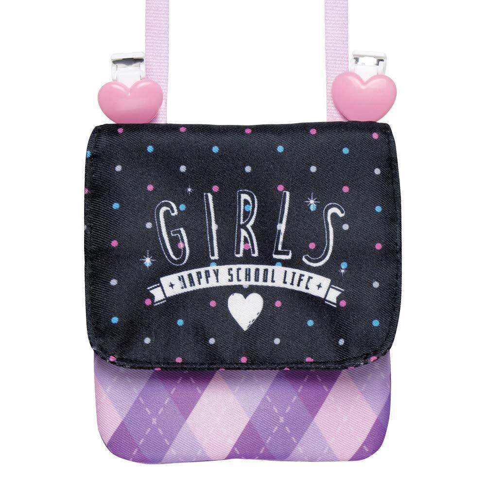 取り外せるショルダーひも&クリップ付の2way長さ調節&安全パーツ&ファスナーポケット付き!